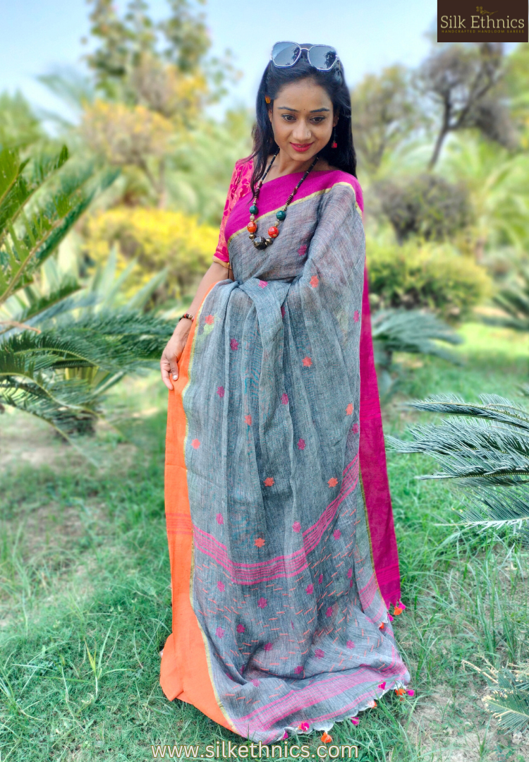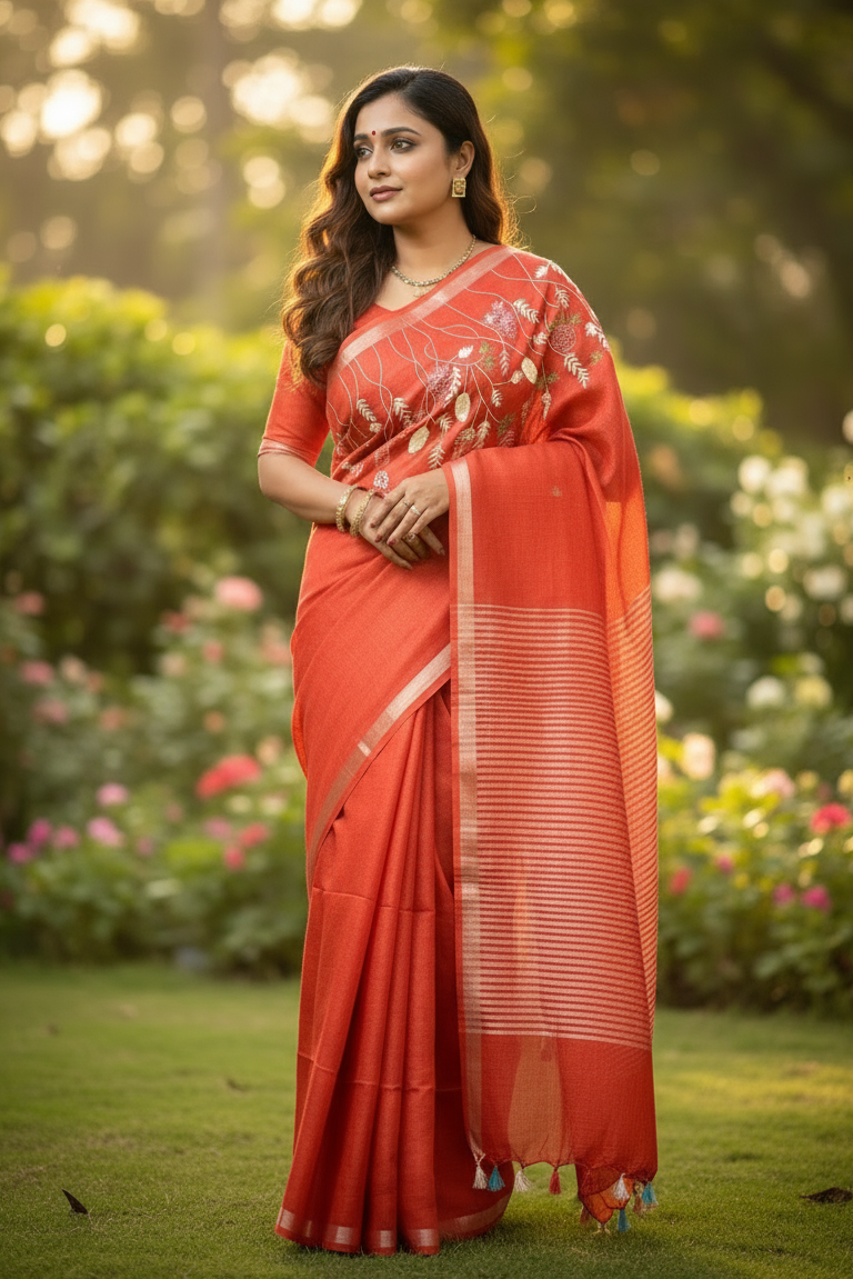 Copper tissue handloom linen saree