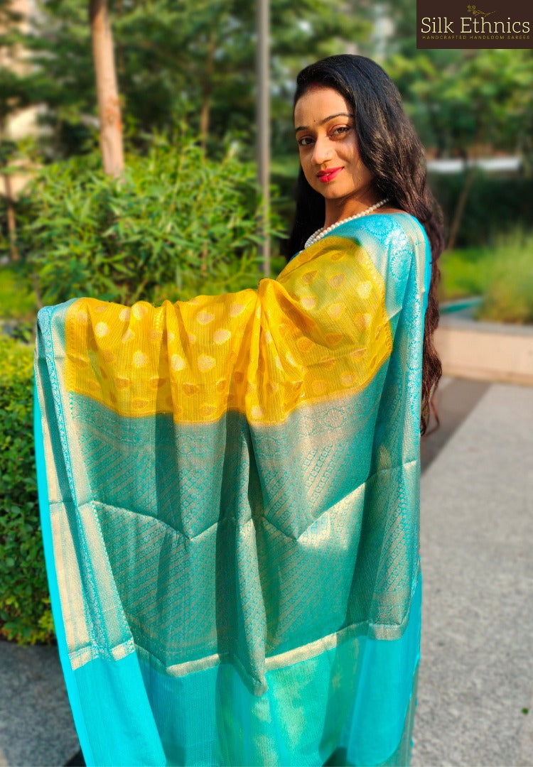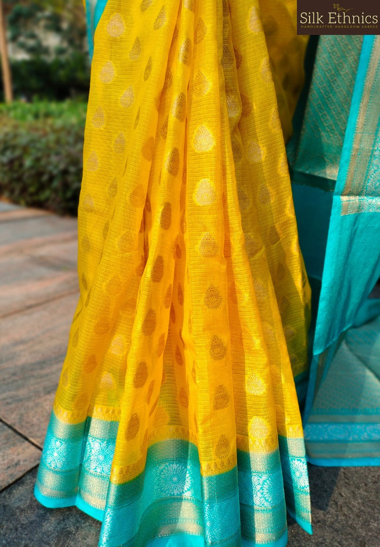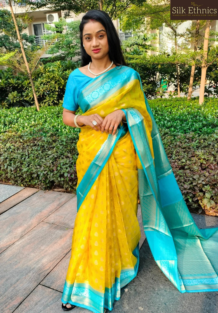 This vibrant golden yellow and blue Banarasi Semi Kota checks saree is a beautiful blend of Banarasi silk in kota styled intricate checkered pattern. Saree has allover zari buttas , contrast border and pallu and is a classic choice for traditional occasions.