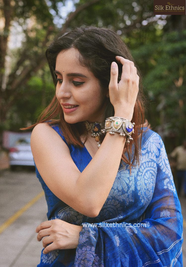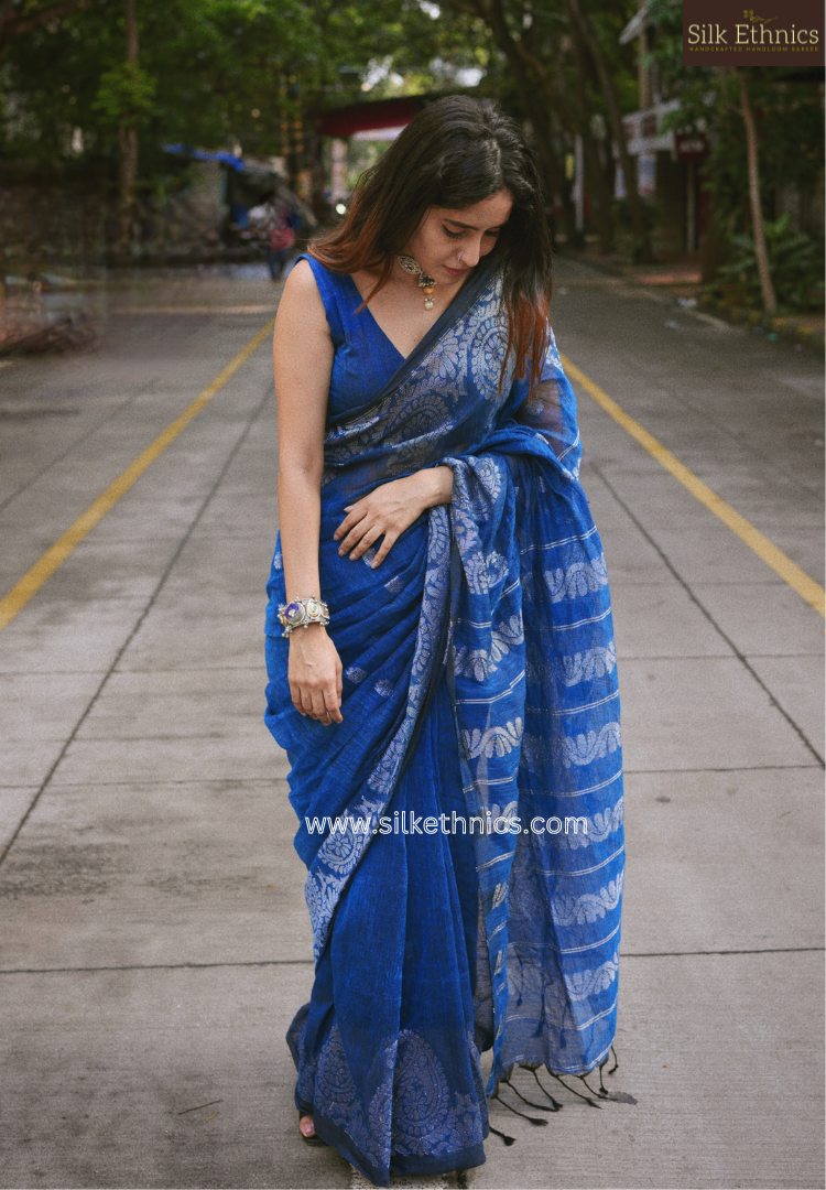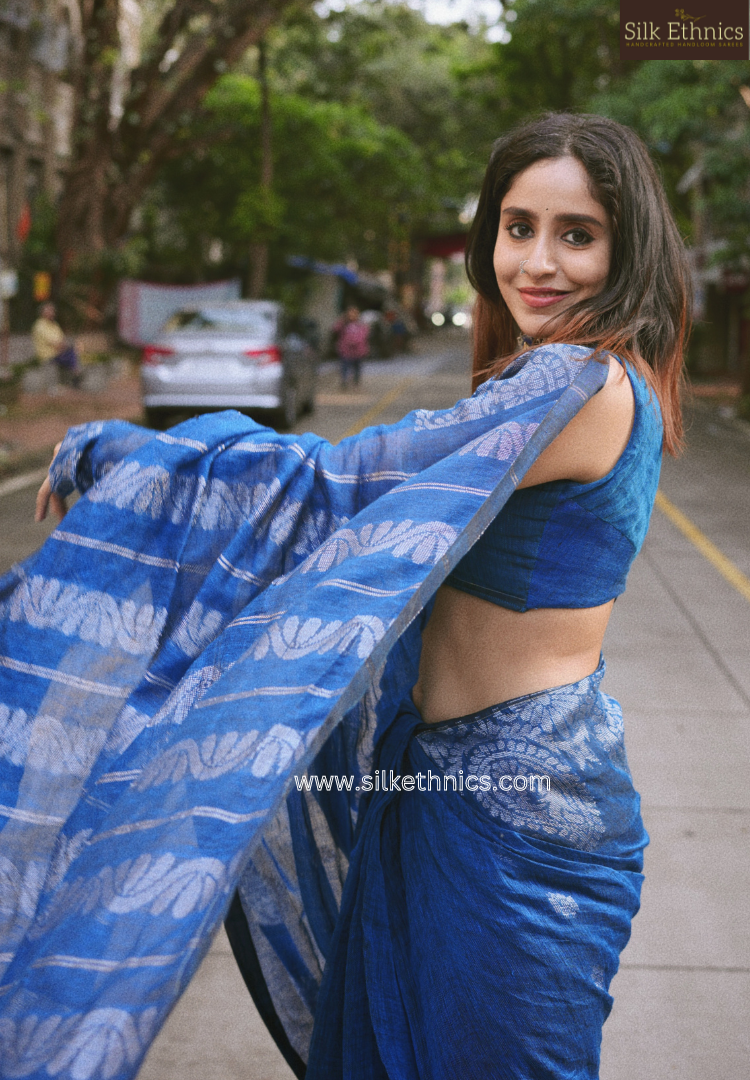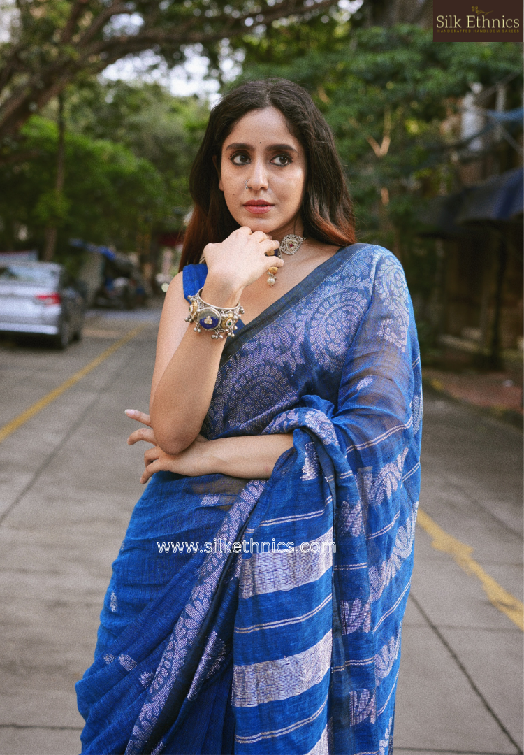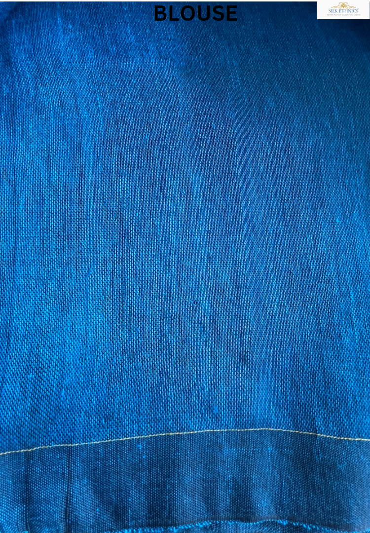A stunningly rich cobalt blue pure linen handloom saree with beautiful zari woven mango motif border and pallu.