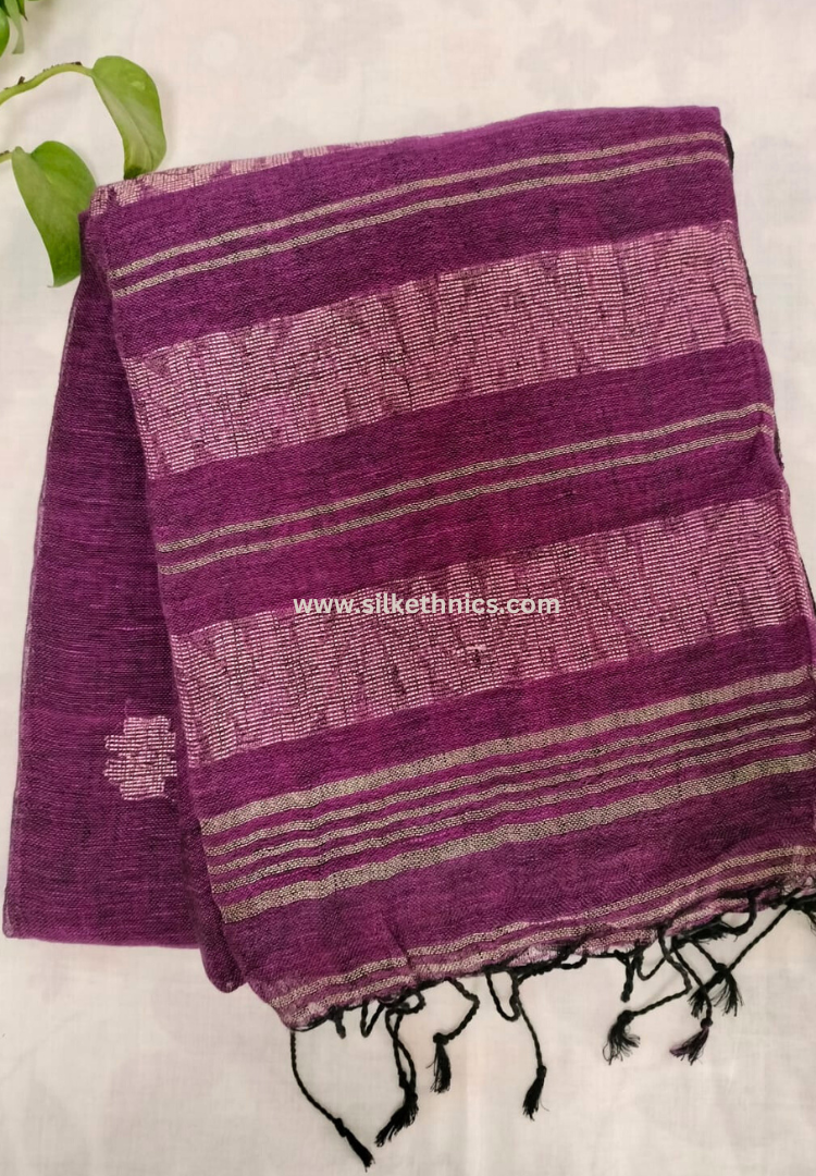 Indulge in the luxurious feel of our royal purple handloom linen saree. This exquisite saree is handwoven with pure linen, showcasing stunning mango motif design. Elevate your wardrobe with this sophisticated and exclusive piece that exudes elegance and timeless style.