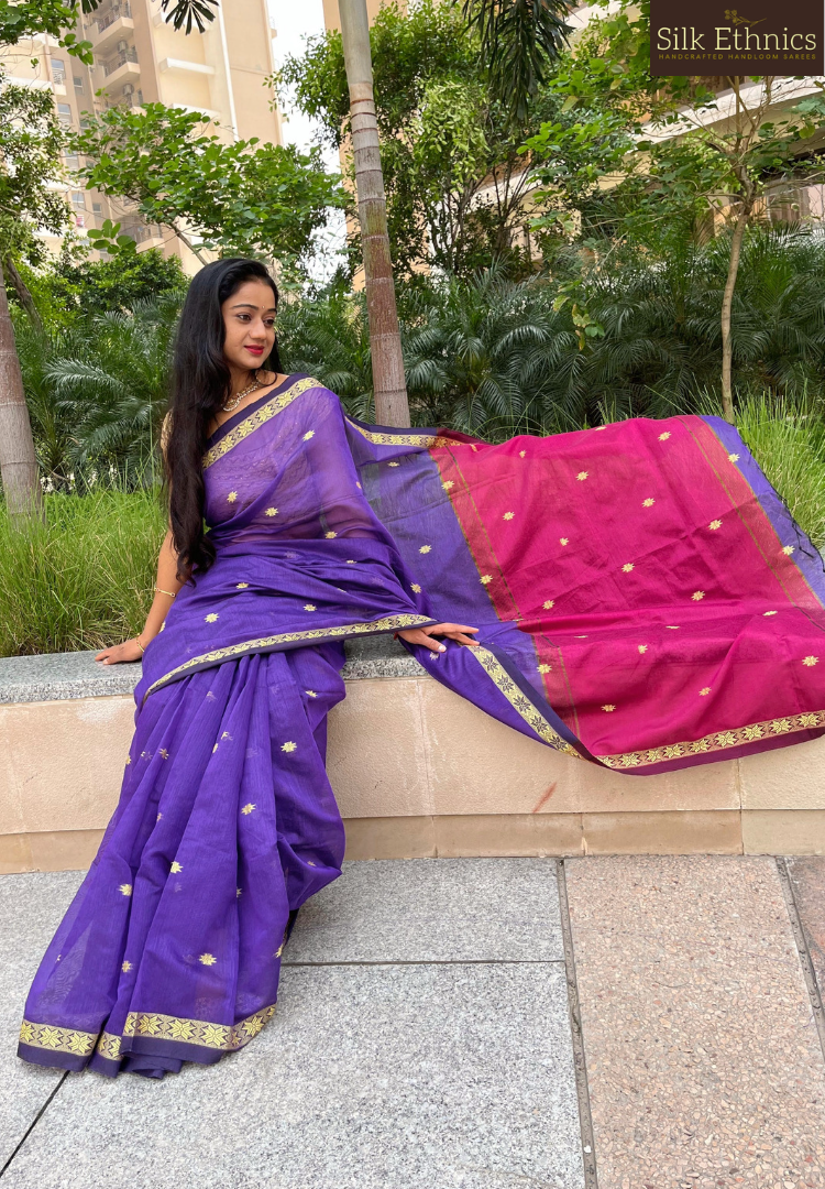 A stunningly beautiful aesthetic purple and pink pure handloom Maheswari silkcotton saree with woven butti design all over and contrast pallu.
