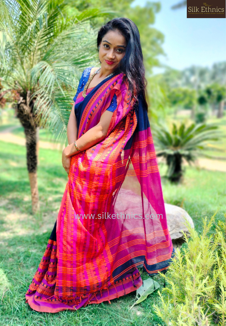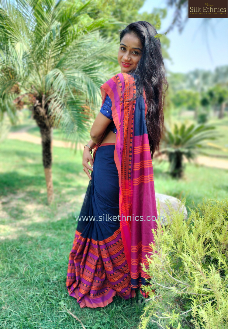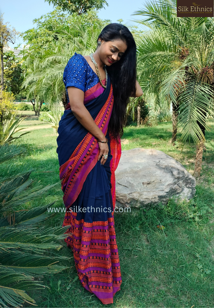 A simpe and elegant Royal blue pure handloom cotton saree with an intricate thread woven border. This exquisite saree crafted from pure cotton is incredibly comfortable and breathable for all-day wear.