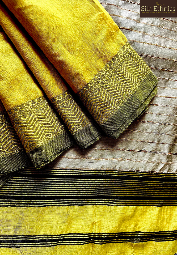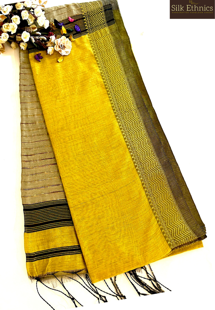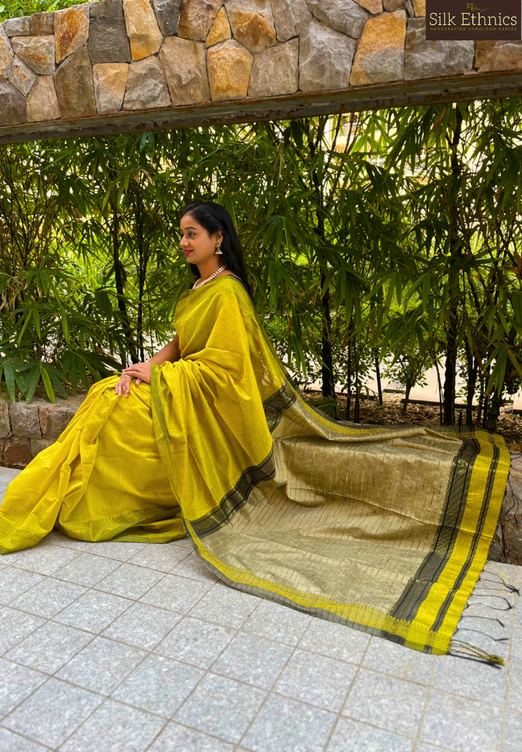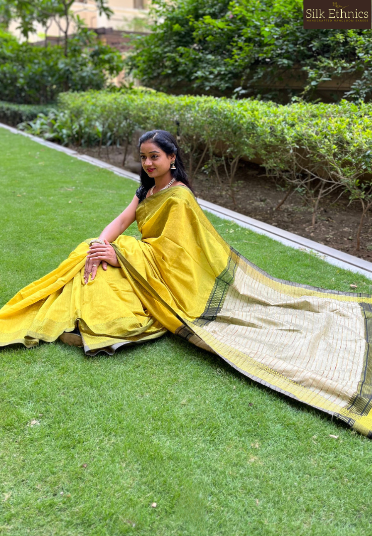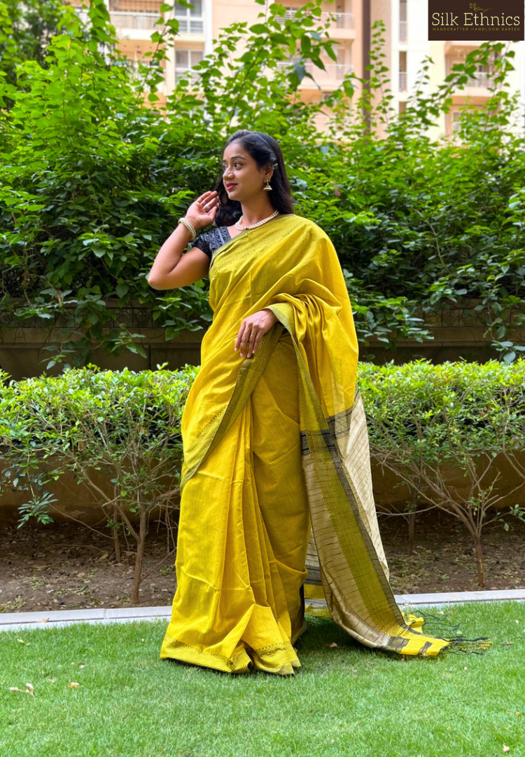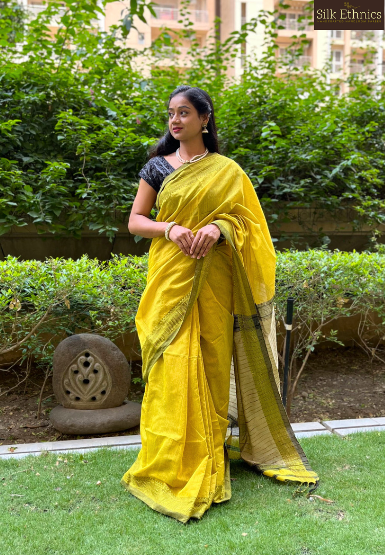 A gorgeous looking rich golden yellow Silkcotton Maheswari saree with zari border and contrast rich pallu.
