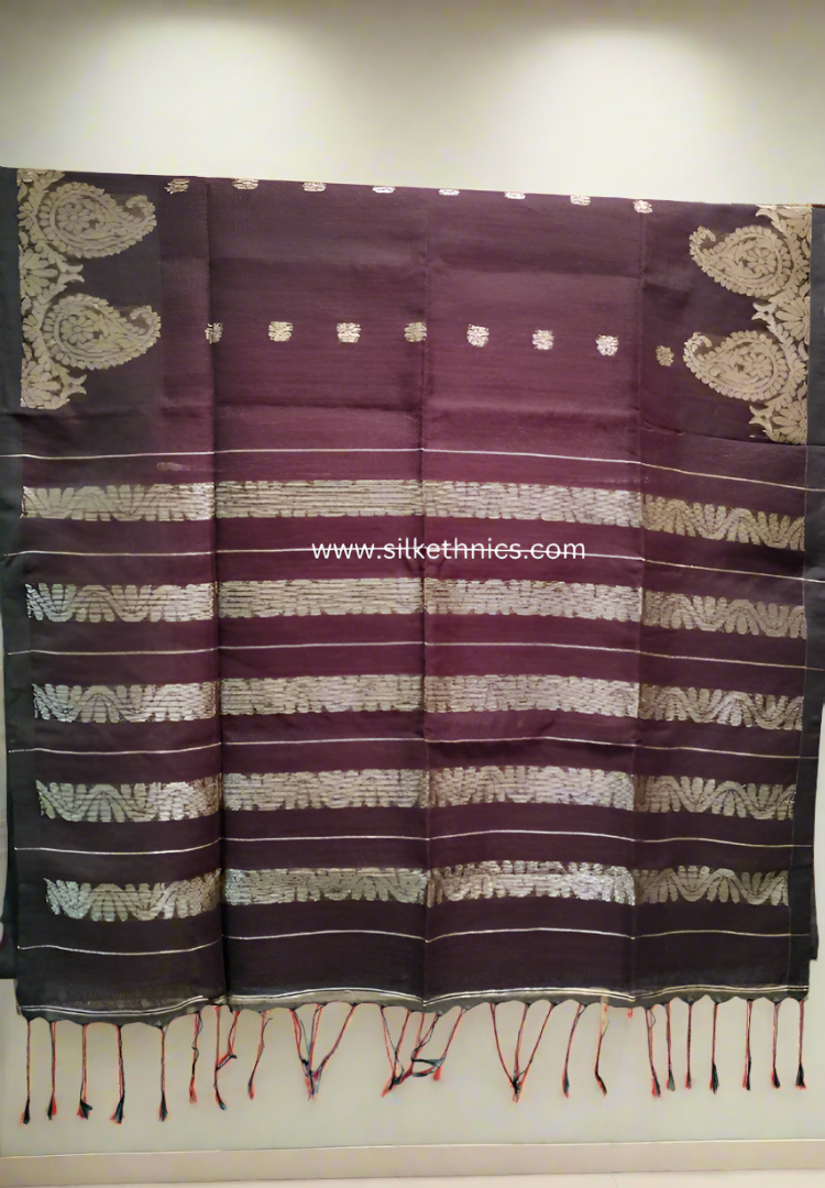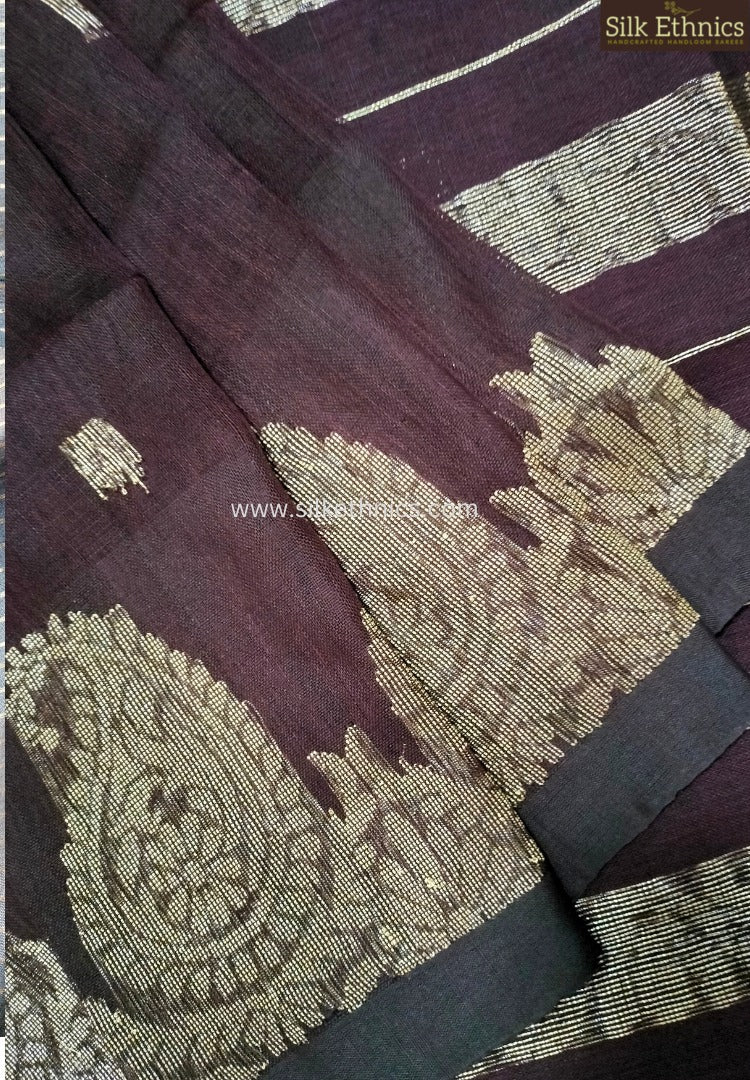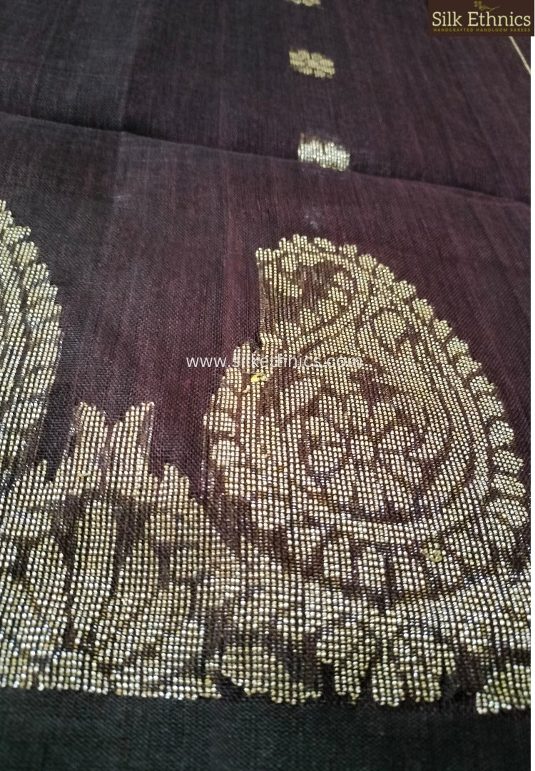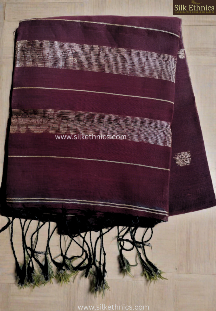 Indulge in luxury with our Rich Wine Handloom Linen Saree, featuring a delicately handwoven zari mango motif design. Made from the finest quality linen, this saree exudes sophistication and elegance. Elevate your wardrobe with this premium piece, perfect for any special occasion.
