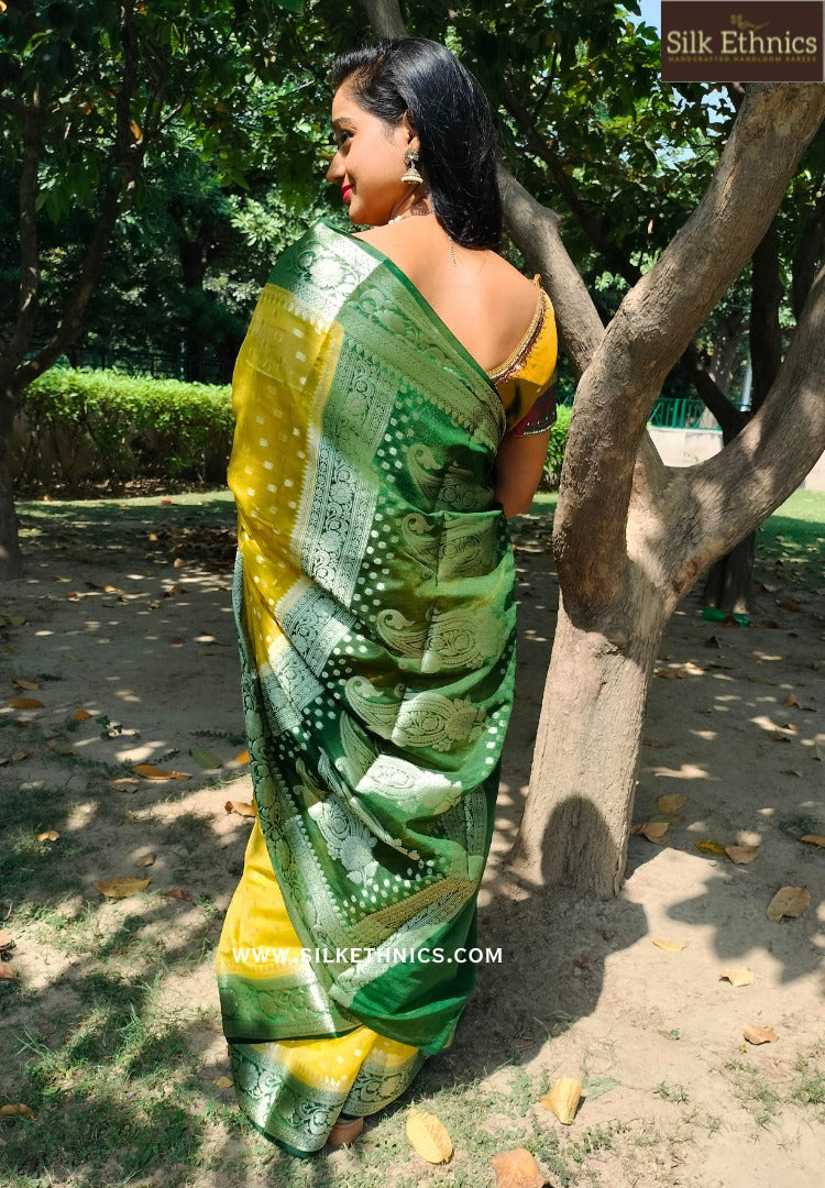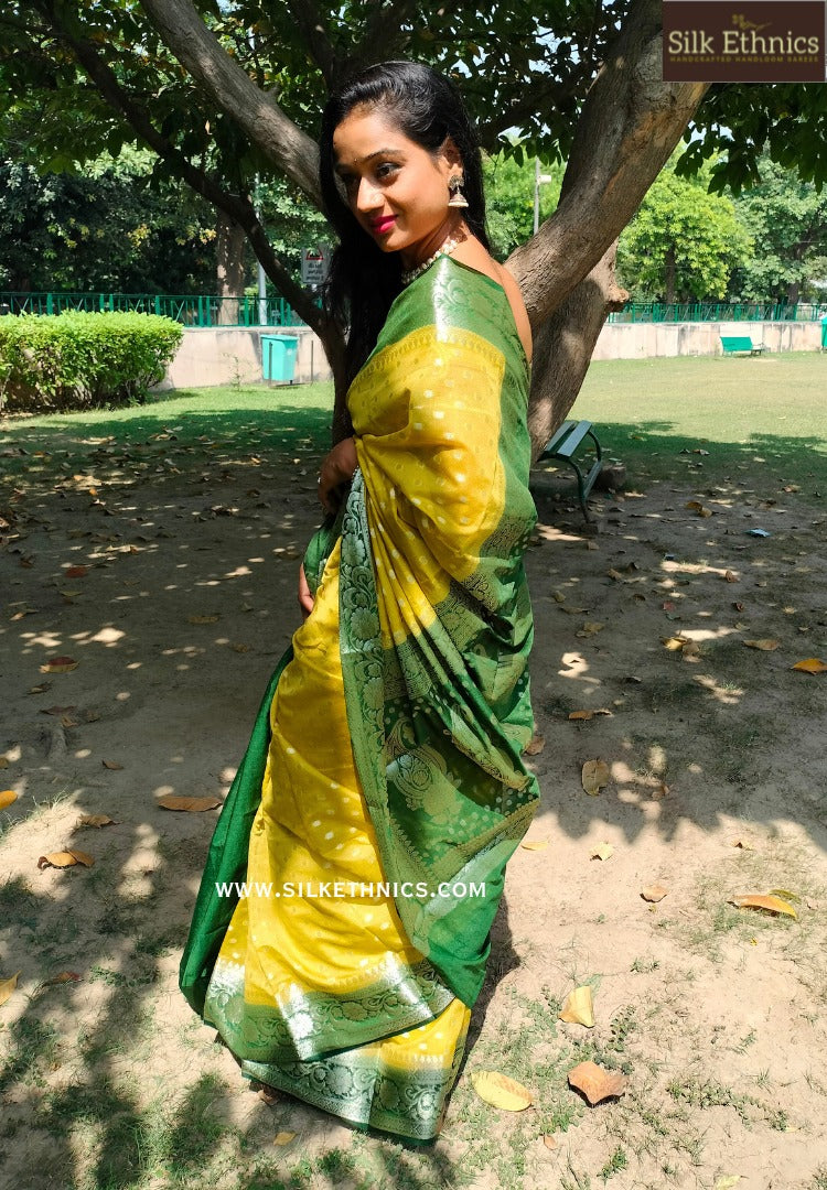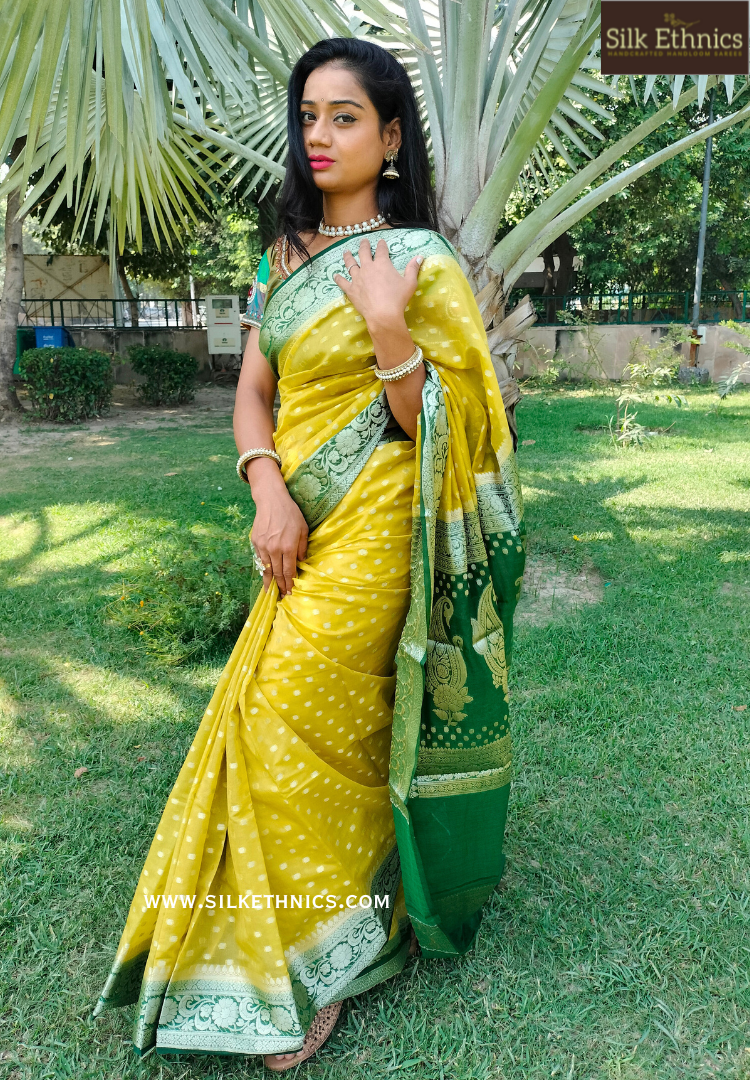 An exquisite Golden yellow and green combination semi geogette Banarasi khaddi silk saree, intricately woven with traditional Banarasi motifs. The semi georgette fabric adds a touch of grace, making it a perfect pick for formal and special occasions.