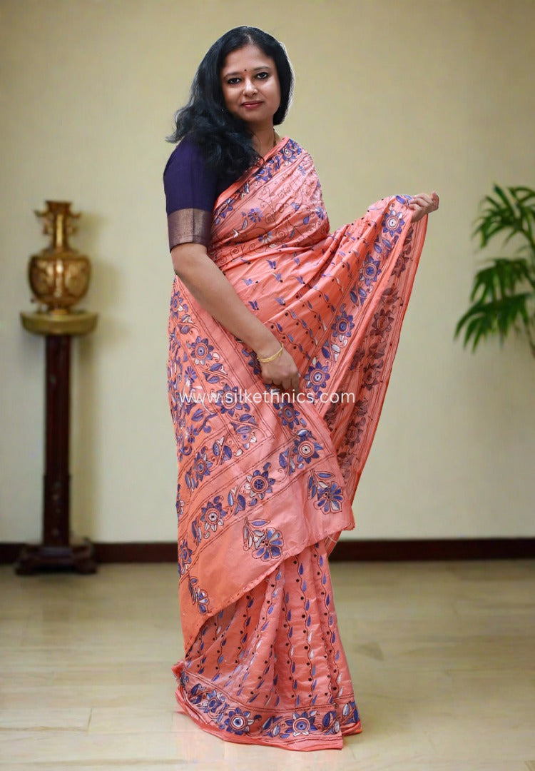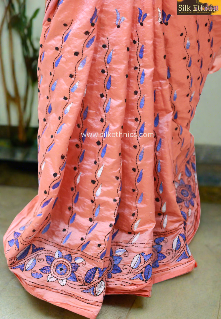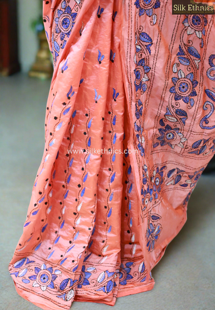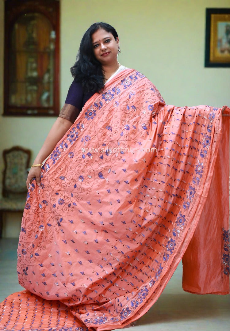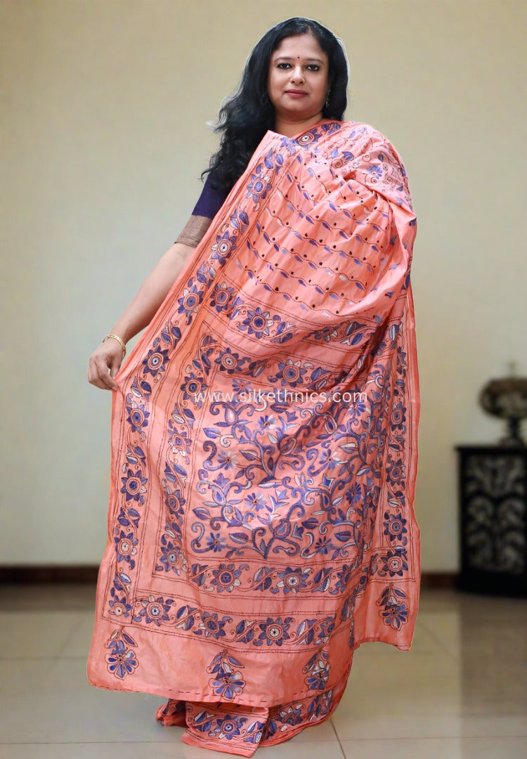 Indulge in the luxurious beauty of our exquisite Coral Peach Hand Embroidered Saree. Made from premium silk and adorned with delicate kantha work, each saree is unique and elegant, ensuring that you stand out at any festive occasion. Every piece is crafted with utmost care, making it a truly exclusive addition to your wardrobe.