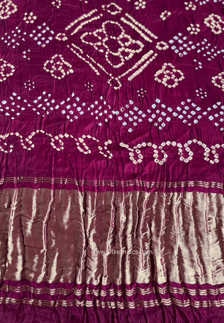 A rich and luxurious Ajrakh Bandhej modal silk saree. Made with centuries old traditional tie and dye printing technique, this saree is exquisite and unique addition to your wardrobe.
