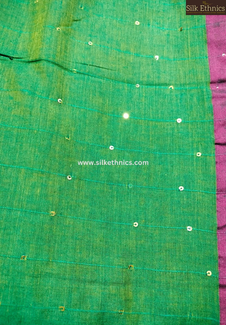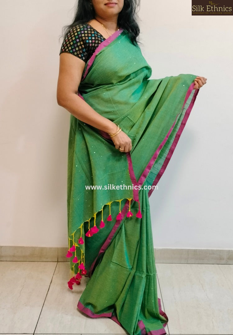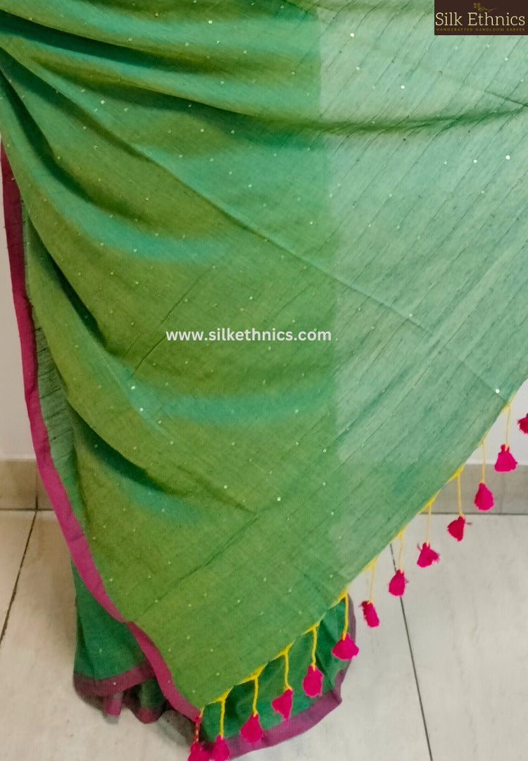 Discover beauty and elegance with our Dualtone Green Pure Handloom Saree. The soft and royal Mul cotton fabric glides gracefully, while the sequin work adds a touch of shimmer. The tasselled pallu completes the look of this luxurious piece, ready to make a statement at any event.
