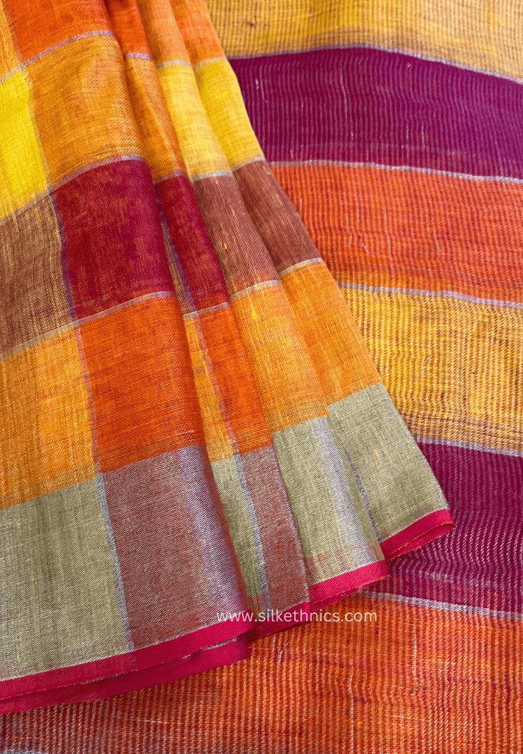 Experience elegance with the Festive Checks Varnika linen saree, crafted from handwoven soft linen in vibrant red and yellow hues. Its zari-striped pallu adds a striking contrast, beautifully complemented by a matching blouse, making it perfect for celebration occasions where refined style is essential.