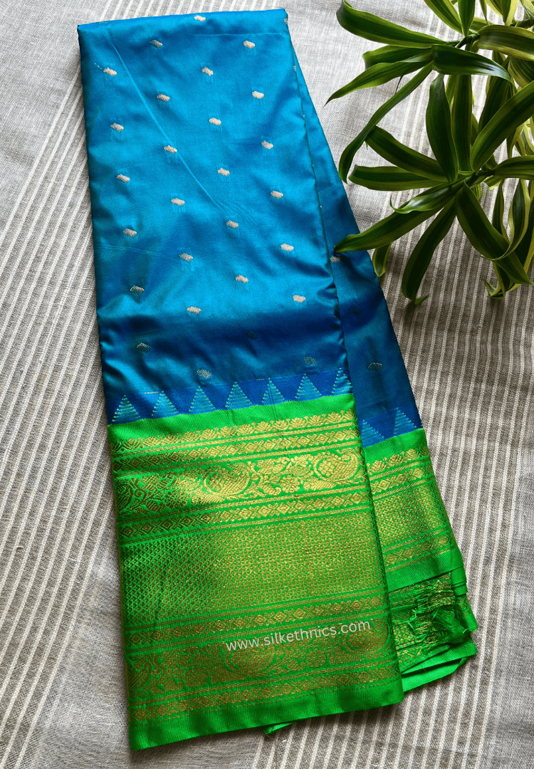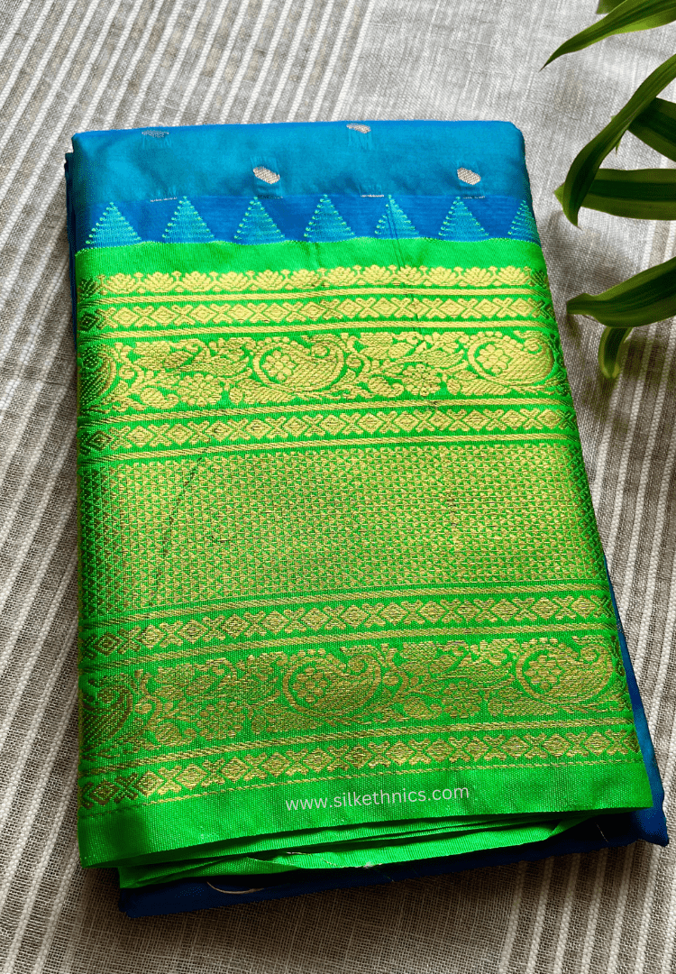 The Gadwal Grace Emerald Aqua silk saree combines traditional South Indian temple border craftsmanship with intricate zari weaving. Featuring a harmonious blend of blue and green hues, this saree is perfect for weddings, festivals, and temple visits, offering a sophisticated and timeless appeal rooted in cultural elegance.