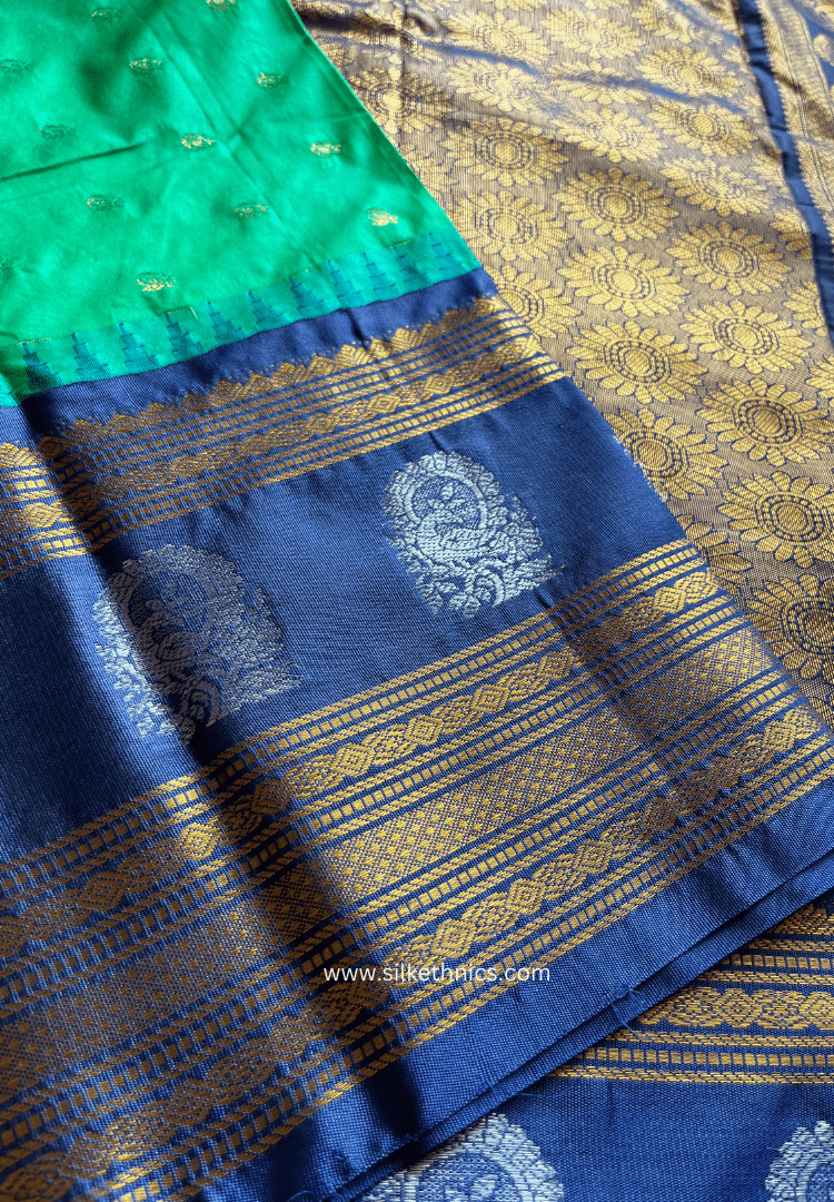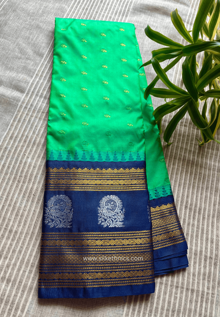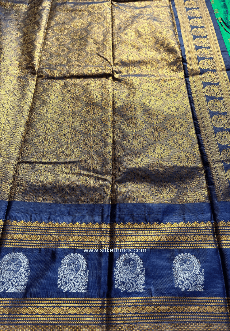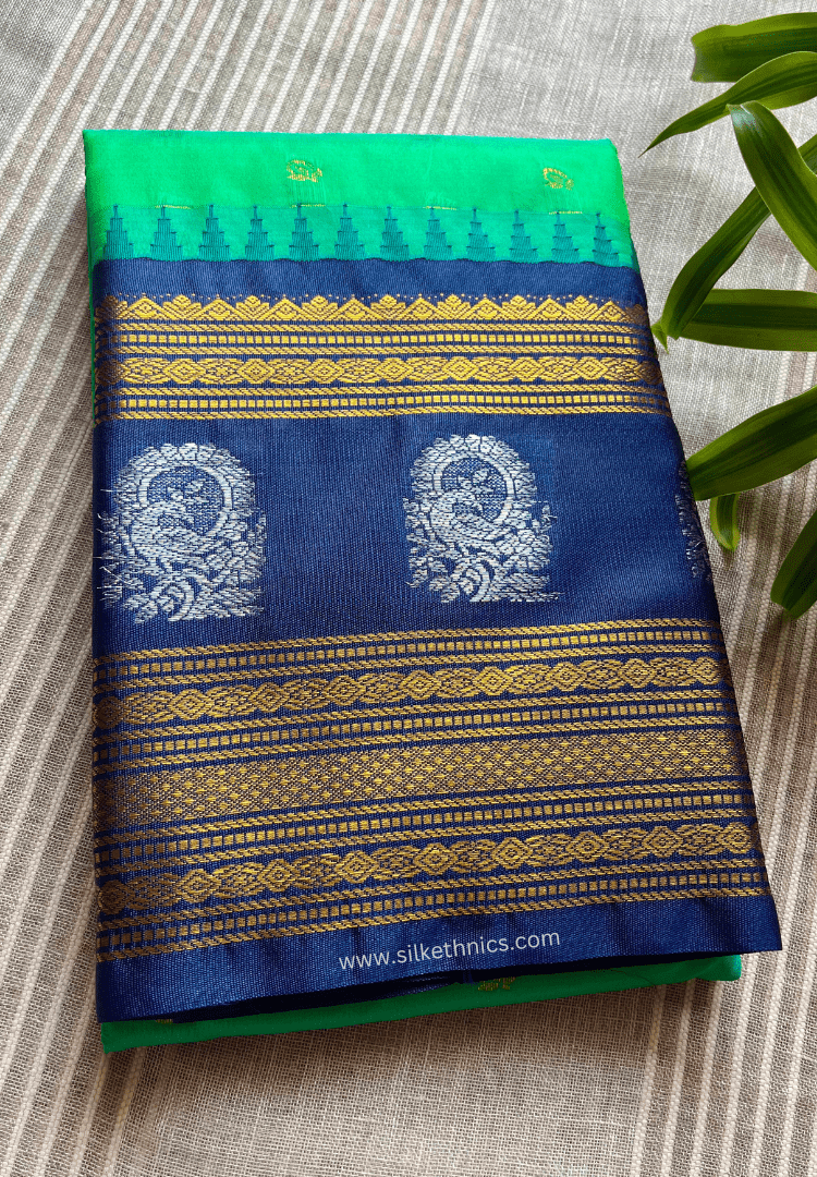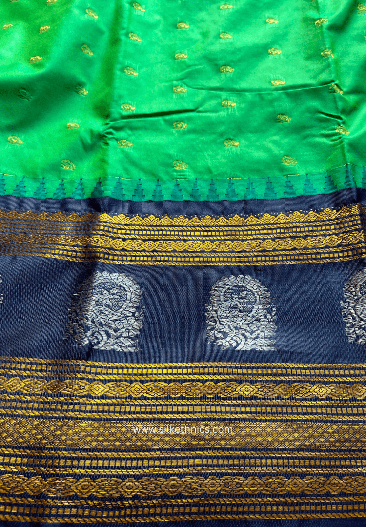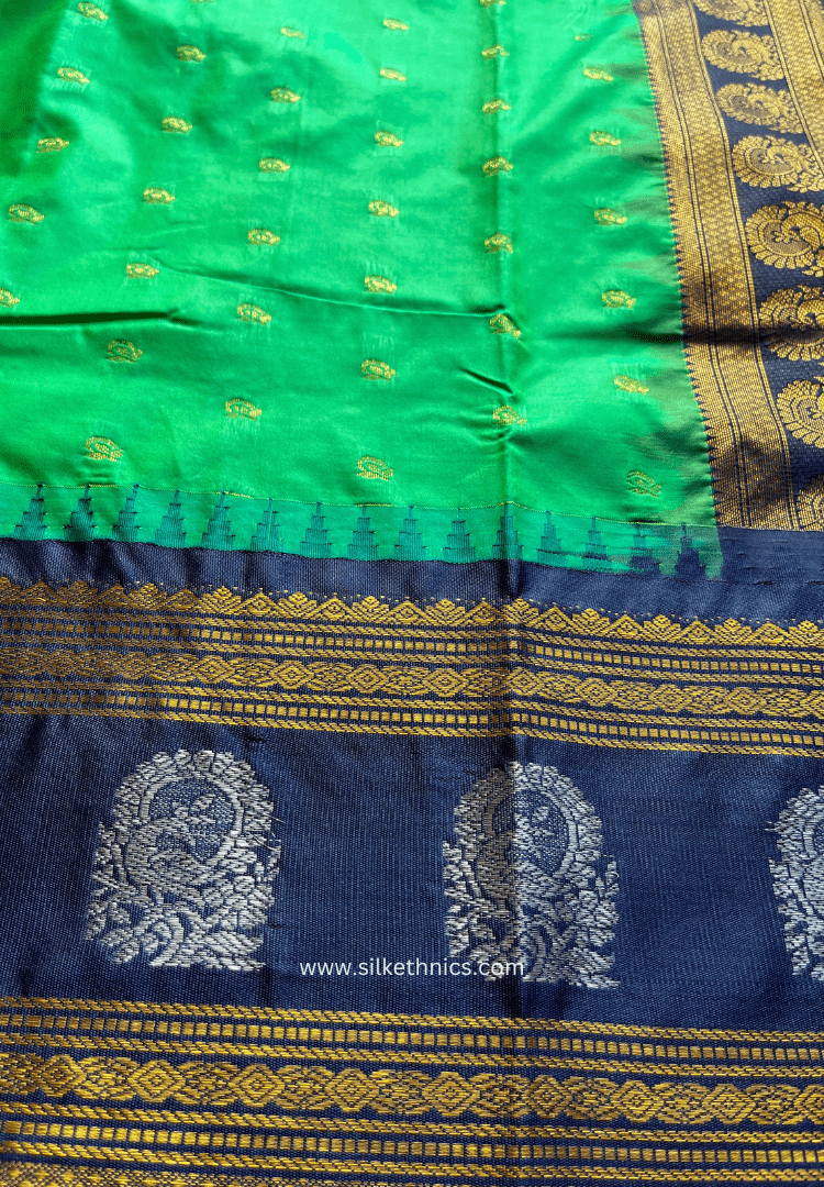 The Gadwal Grace Spring Royale silk saree features a vibrant green body paired with a navy blue traditional temple border. Its rich pallu is adorned with intricate zari woven motifs, making it an exquisite choice for festive occasions, weddings, and celebrations. This saree combines classic artistry with refined elegance, perfect for those seeking a sophisticated and timeless look.