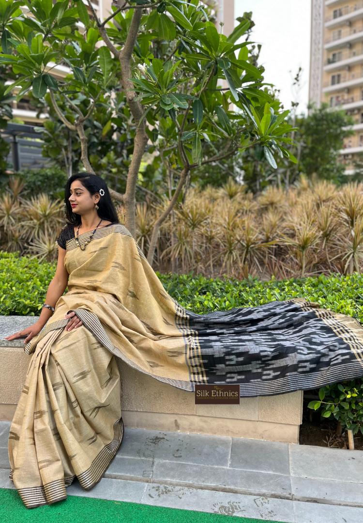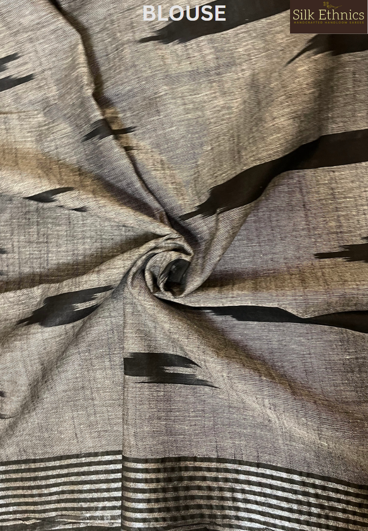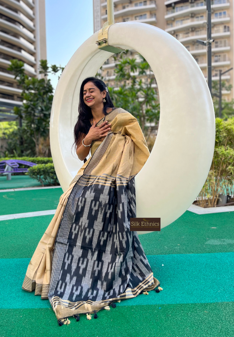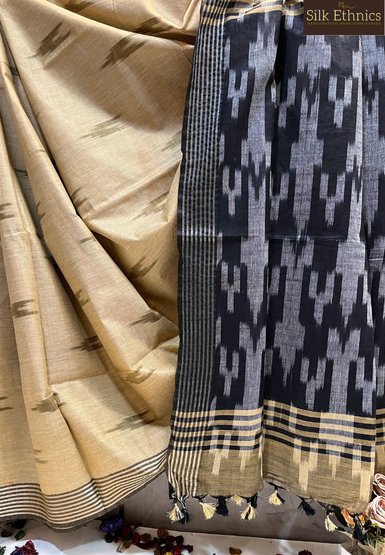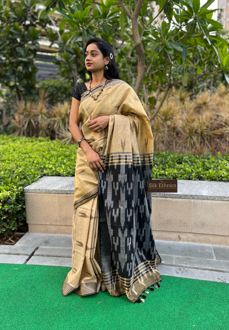 A beautiful combination of gold and black slub linen ikkat weaving saree with a contrast ikkat woven pallu and blouse.