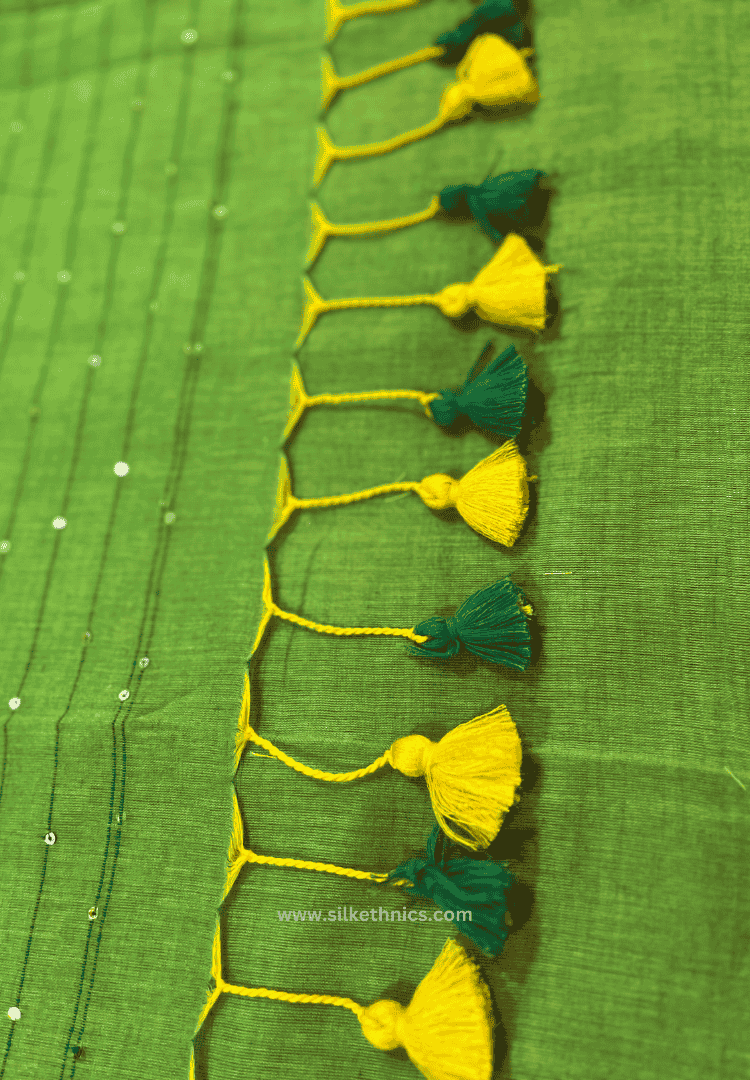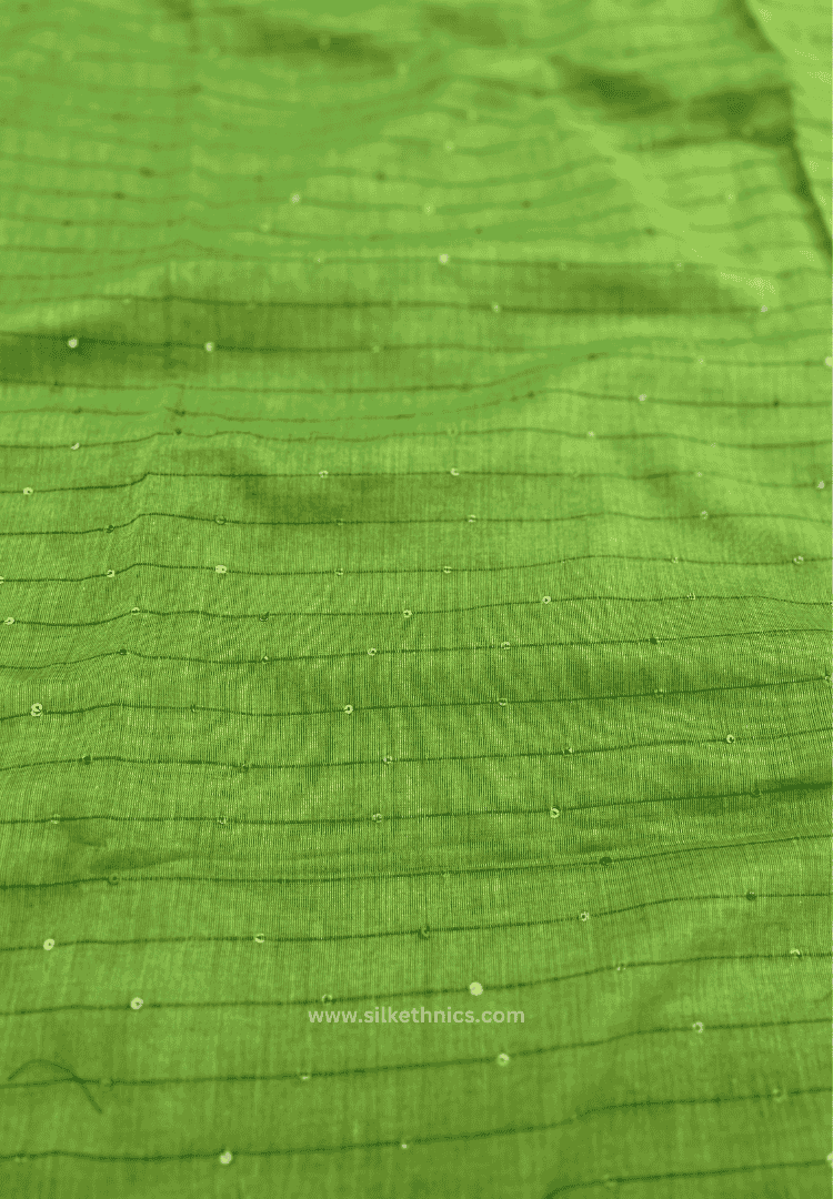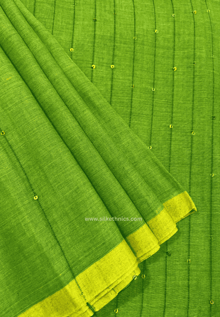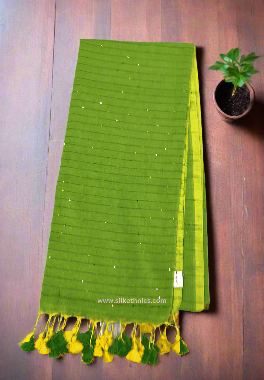 Elevate your style with our vibrant Green Sequins Rangreet Mul cotton saree, designed for the sophisticated and exclusive. Feel graceful and luxurious in this soft, flowy fabric adorned with beautiful sequins work. Perfect for work or parties, the vibrant tassels add a touch of elegance to this must-have piece.