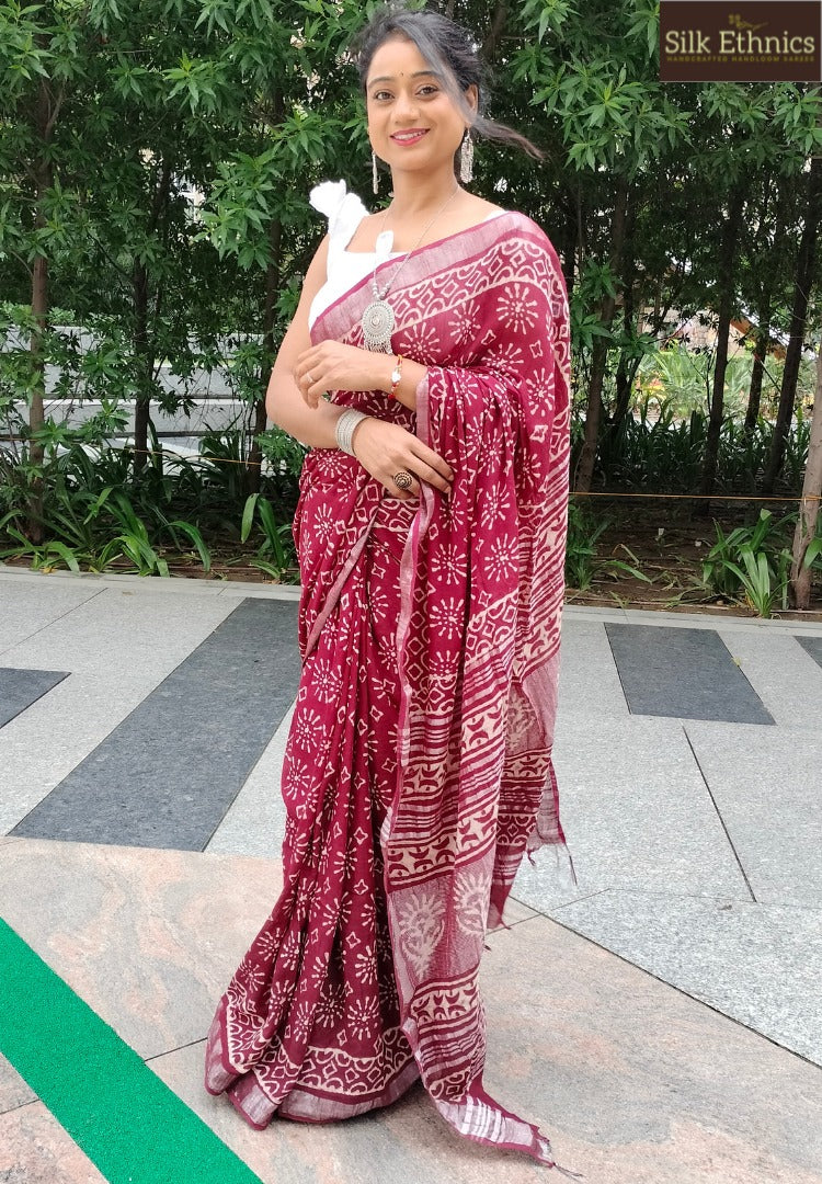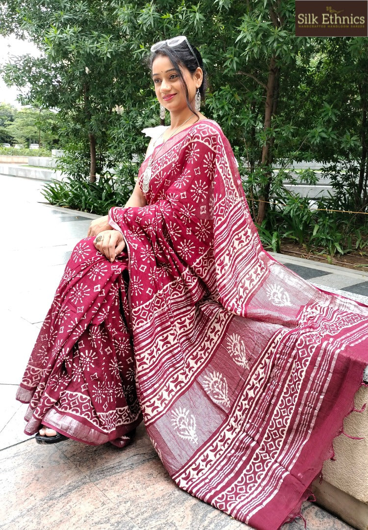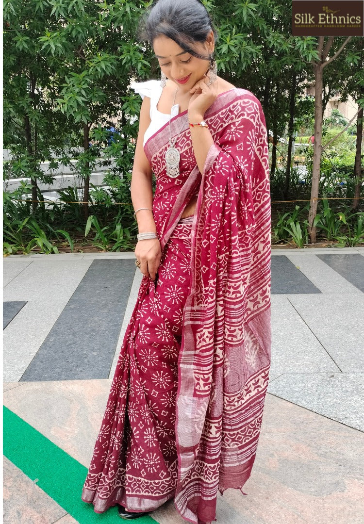 timeless and verstile trendy looking rich maroon linen saree with zari border. Handmade with natural colours and dyes.