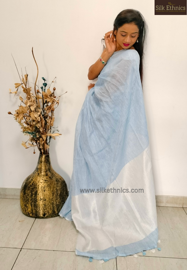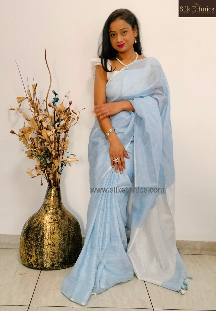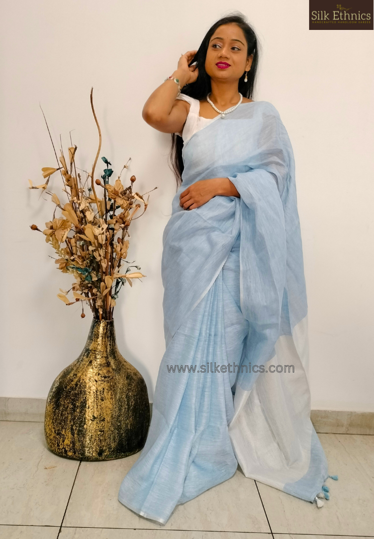 Luxurious, exquisite, minimalistic and elegant this powder blue pure linen saree is a must have in your wardrobe. The zari border completes its look and brings out the elegance of the saree.