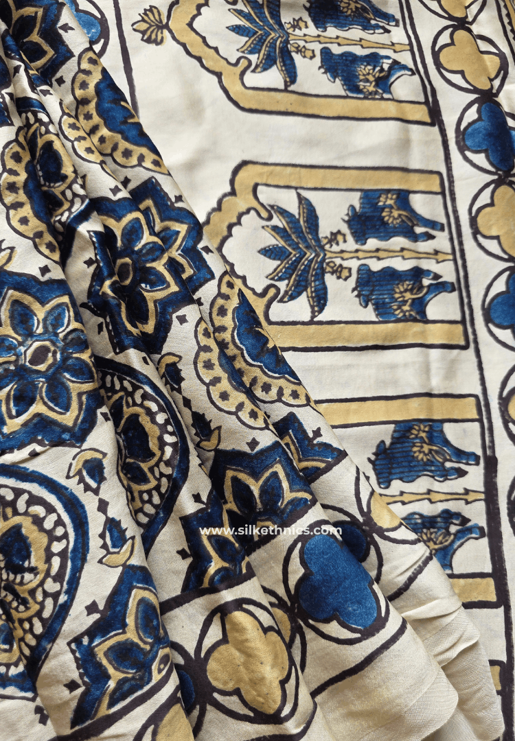 Discover the timeless elegance of our Ivory and Blue Ajrakh handblock printed modal saree, a masterpiece of artisanal craftsmanship from Kutch. Each piece is meticulously created using organic, natural dyes and traditional block printing techniques, ensuring no two sarees are identical. Crafted from luxuriously soft modal fabric, this saree seamlessly transitions from office to evening gatherings with its minimalistic yet sophisticated design. Embrace sustainable fashion without compromising on style—a conscious choice for the modern, discerning woman who values heritage, quality, and environmental responsibility.