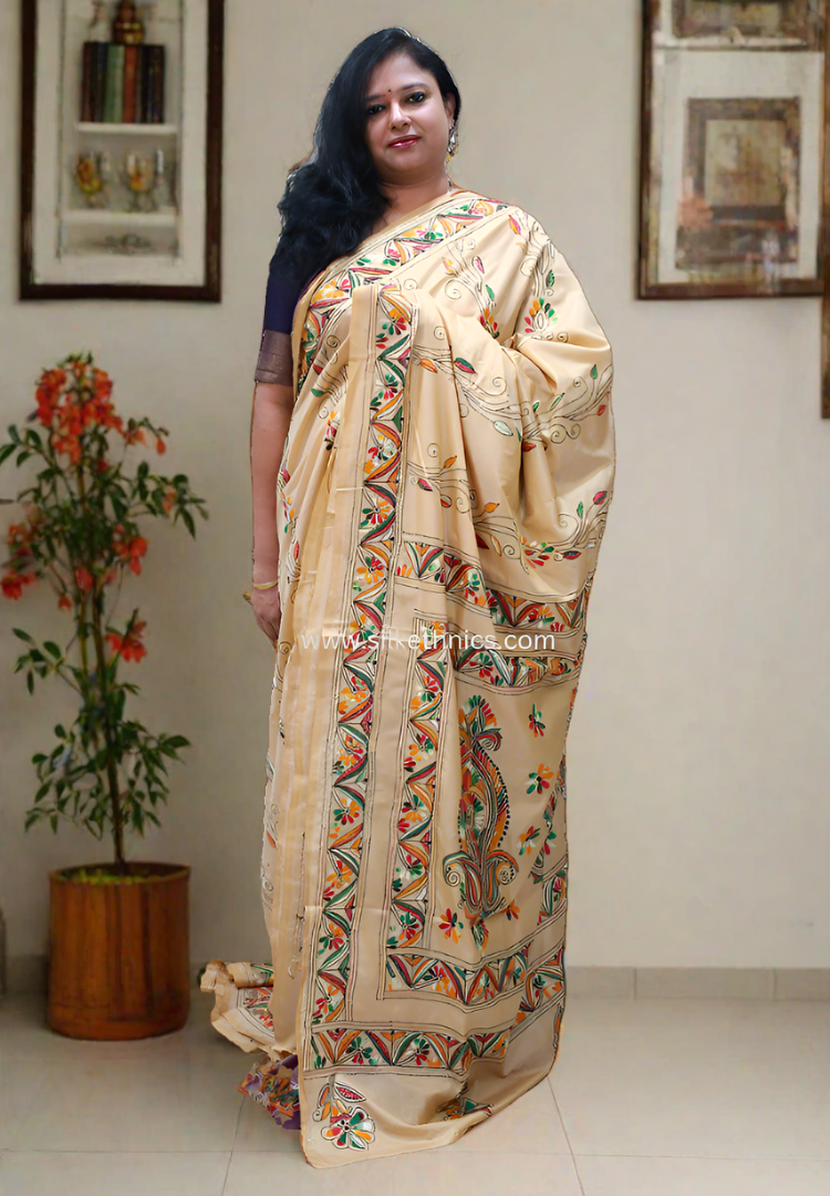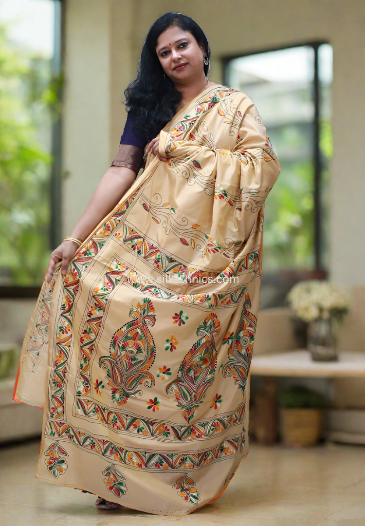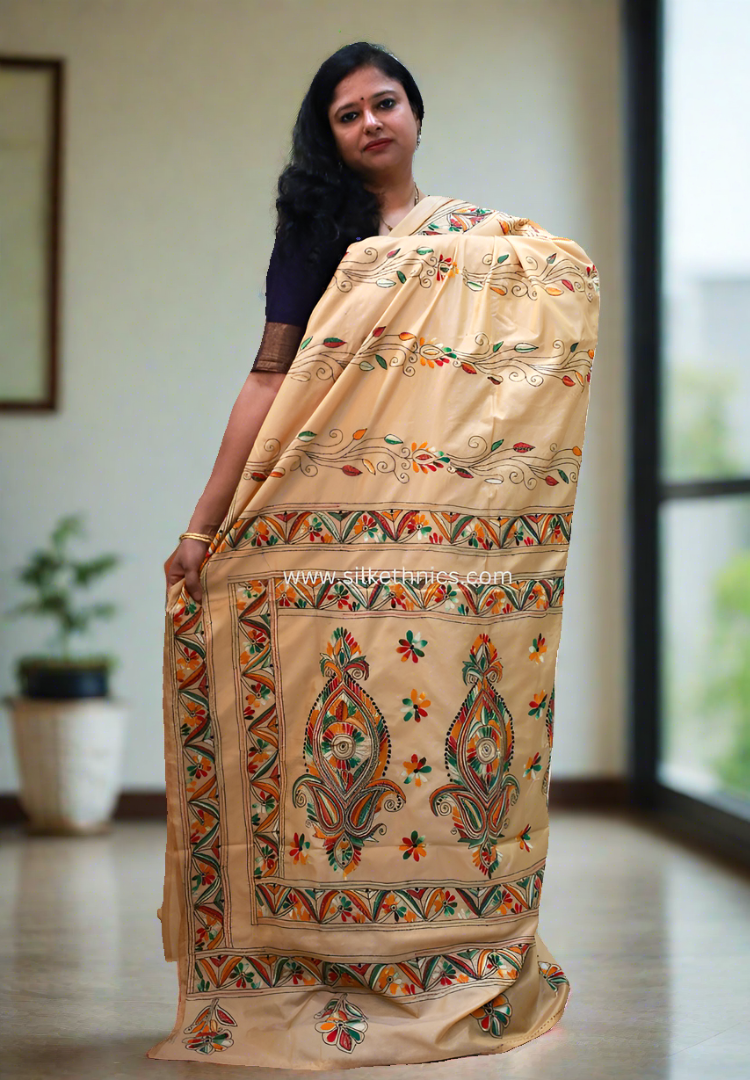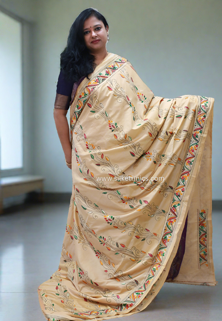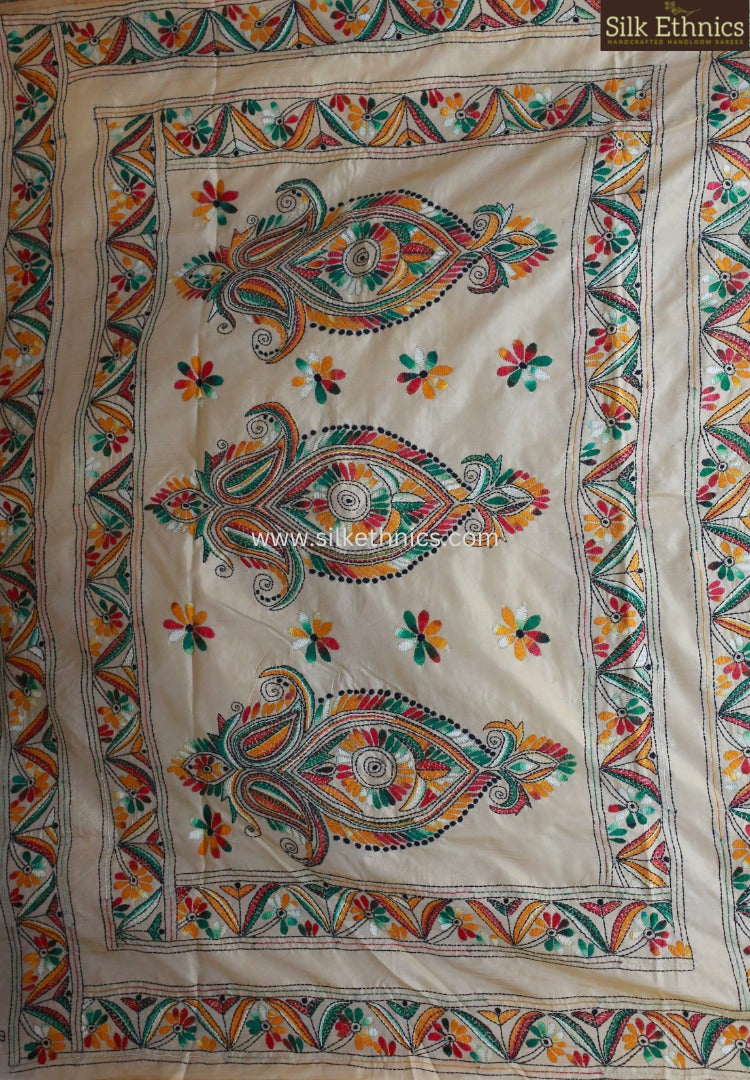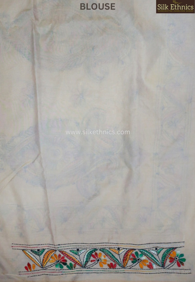 Indulge in luxury with our Ivory hand embroidered silk saree. This premium piece features hand embroidered kantha work, adding a unique and elegant touch. Crafted with rich and royal silk, this saree is a timeless addition to your wardrobe. Elevate your style with this sophisticated and exclusive saree.