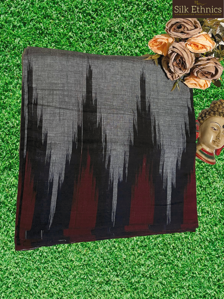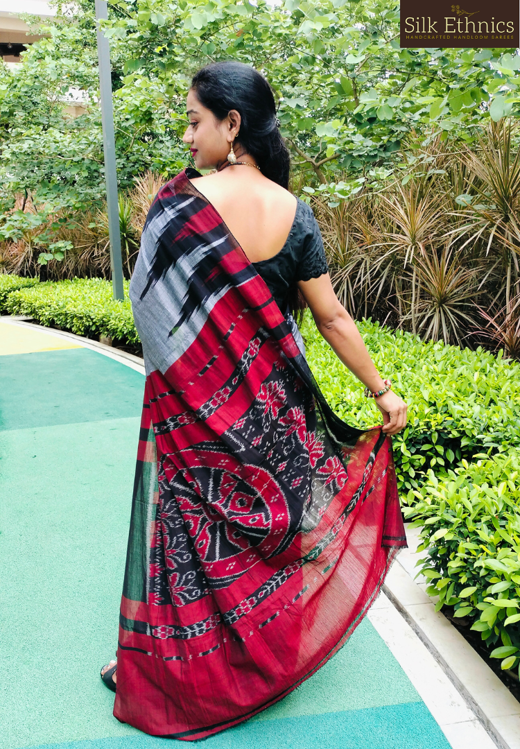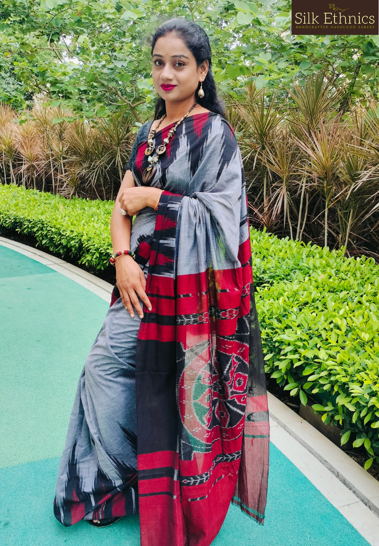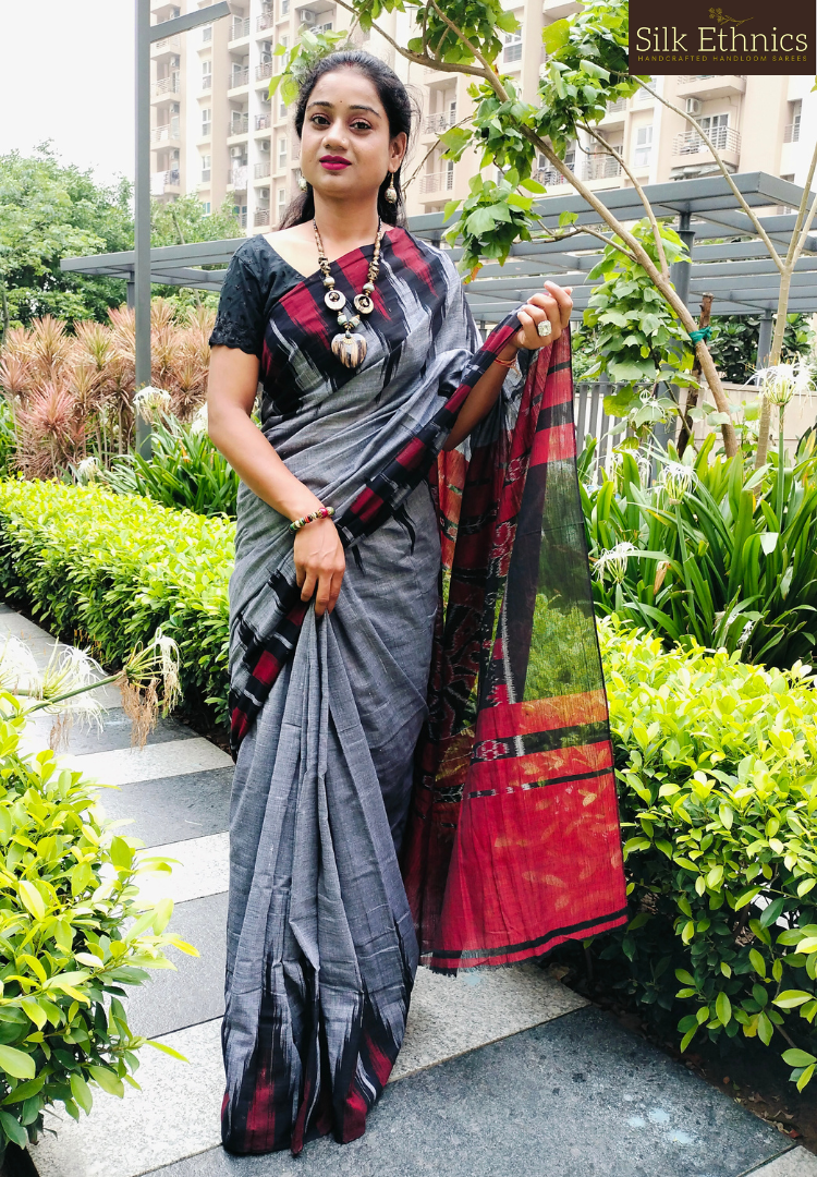A gorgeous handwoven metal gray soft cotton Sambhalpuri saree with a contrast temple designed border and a beautiful Ikkat woven pallu.