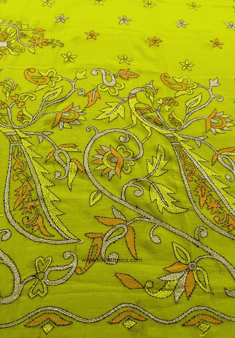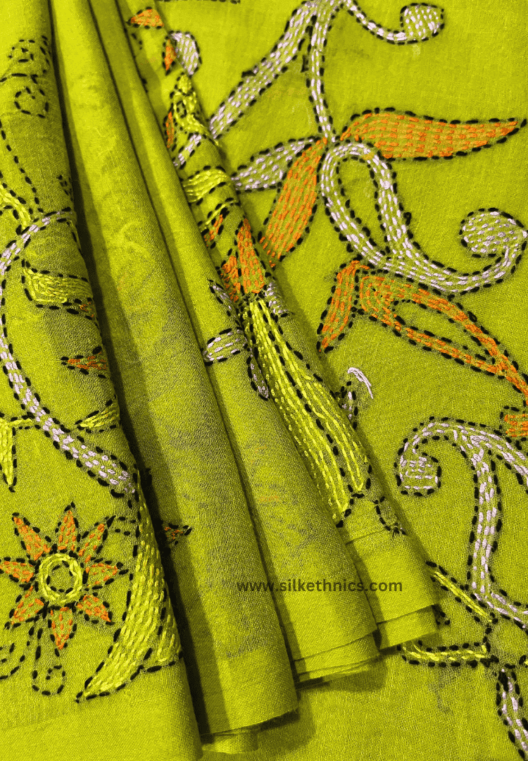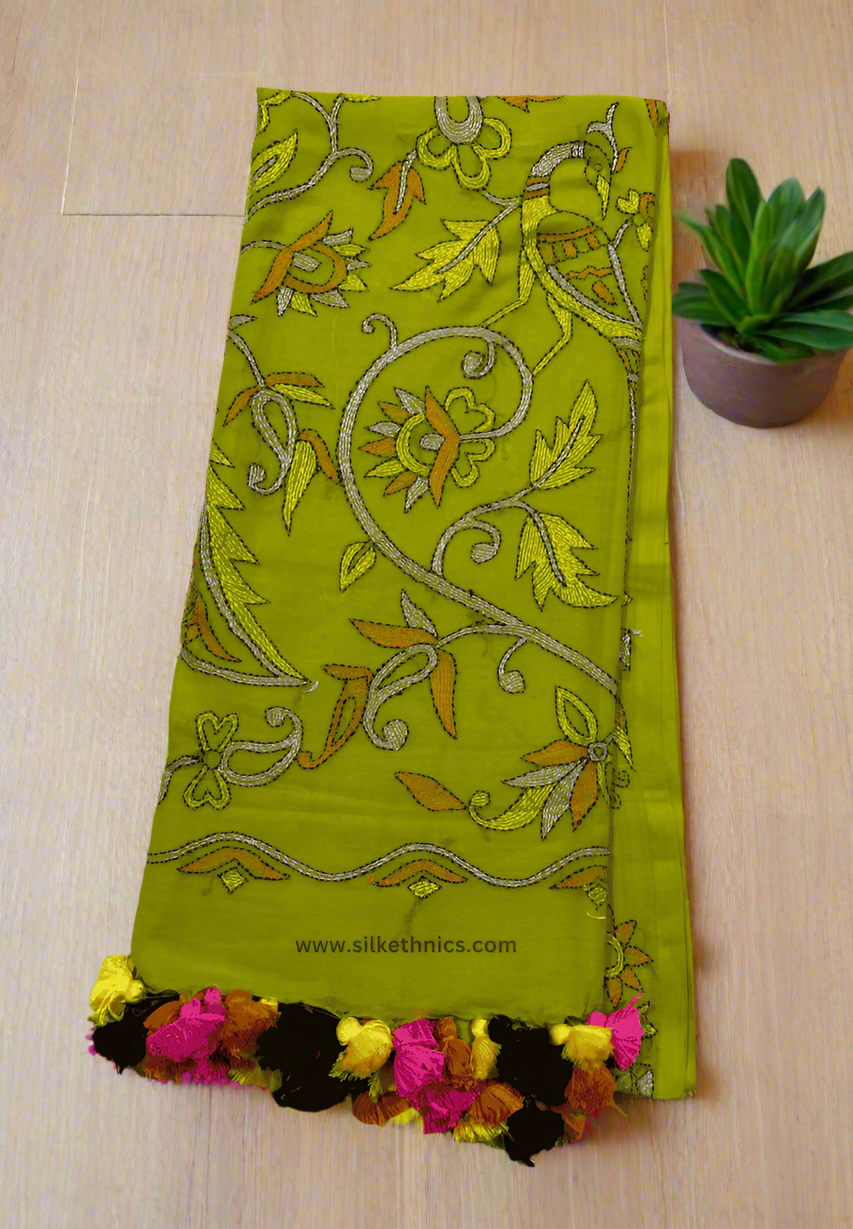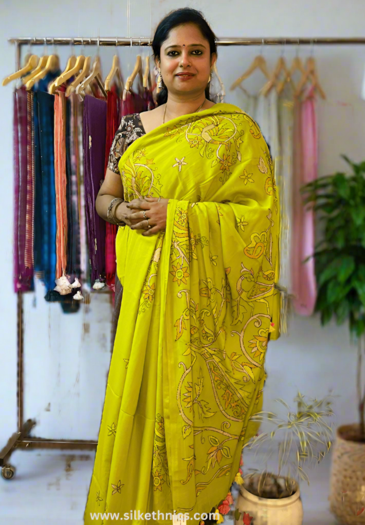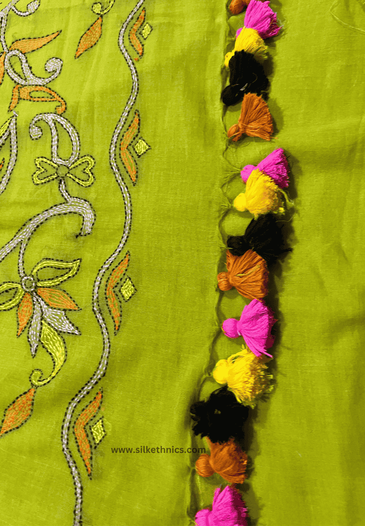 This luxurious lime green hand embroidered mulcotton saree features a soft and flowy texture made of pure handloom fabric. Adorned with intricate hand-embroidered designs inspired by nature, it exudes elegance and sophistication. The tassled pallu adds a touch of exclusivity, making it a must-have for fashion connoisseurs.