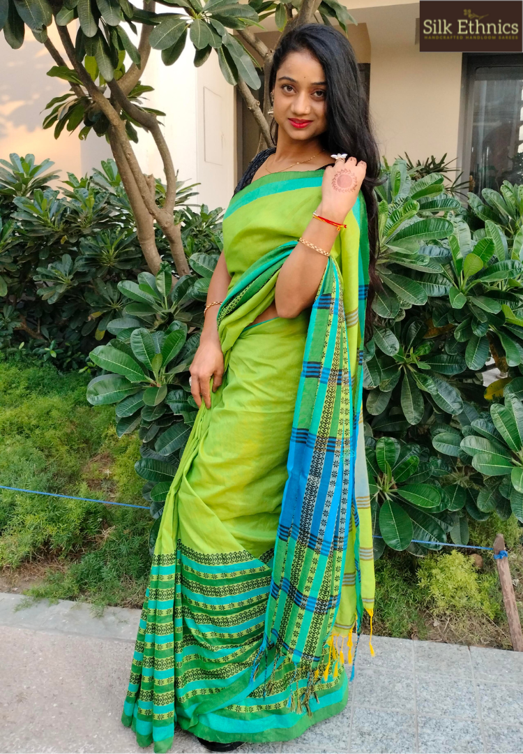 An attractive lime green pure handloom cotton saree with an intricate thread woven border. This exquisite saree crafted from pure cotton is incredibly comfortable and breathable for all-day wear.