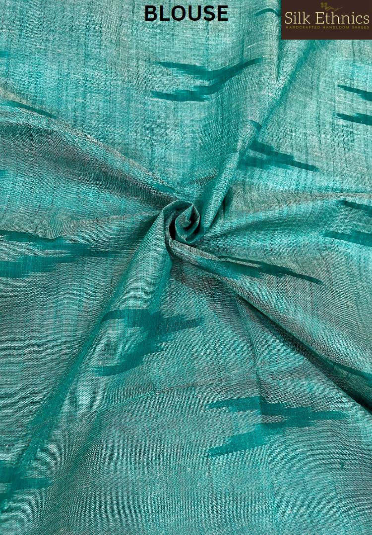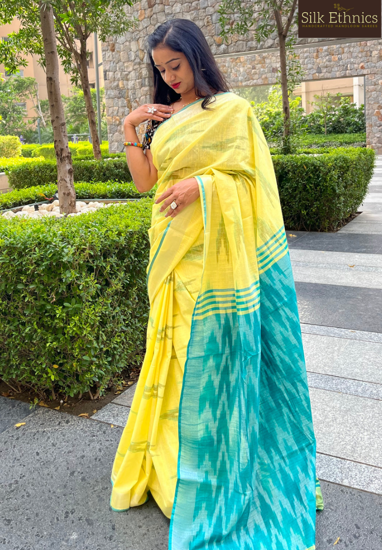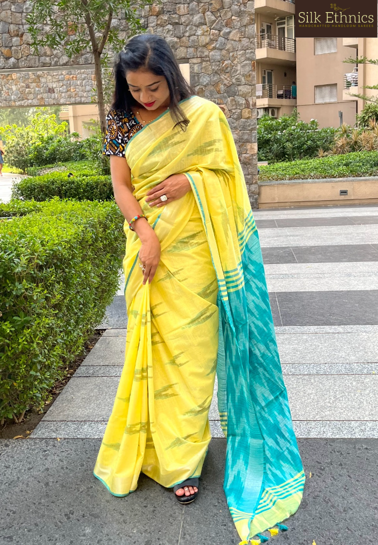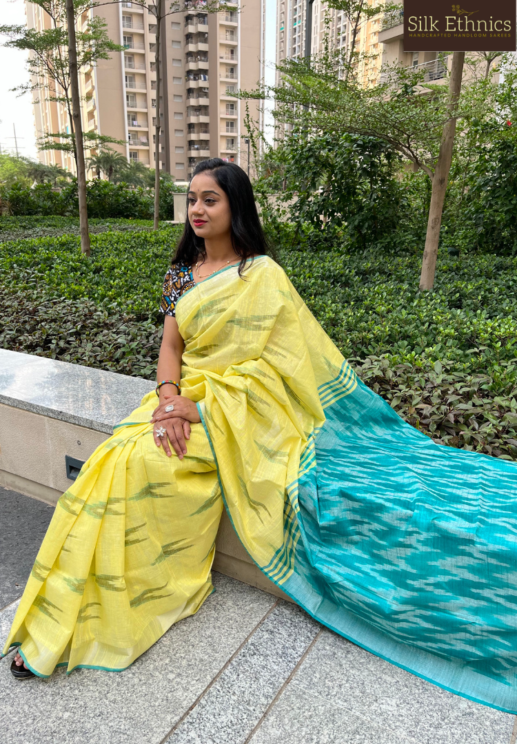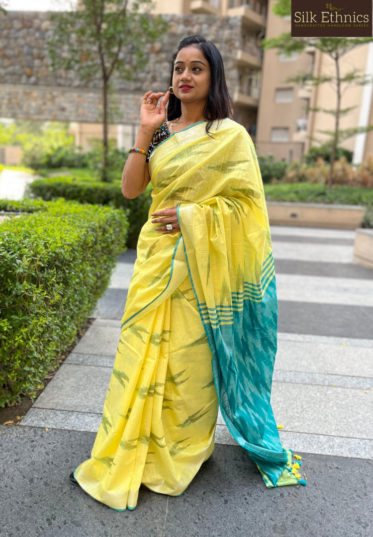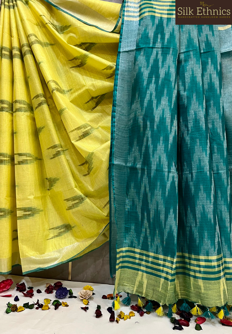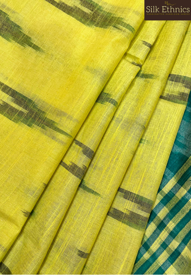 An attractive lemon yellow and green slub linen ikkat weaving saree with a contrast ikkat woven pallu and blouse.