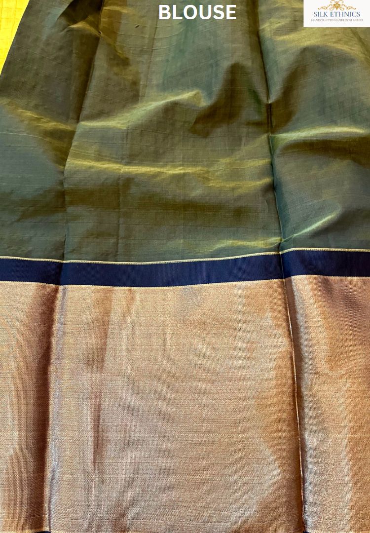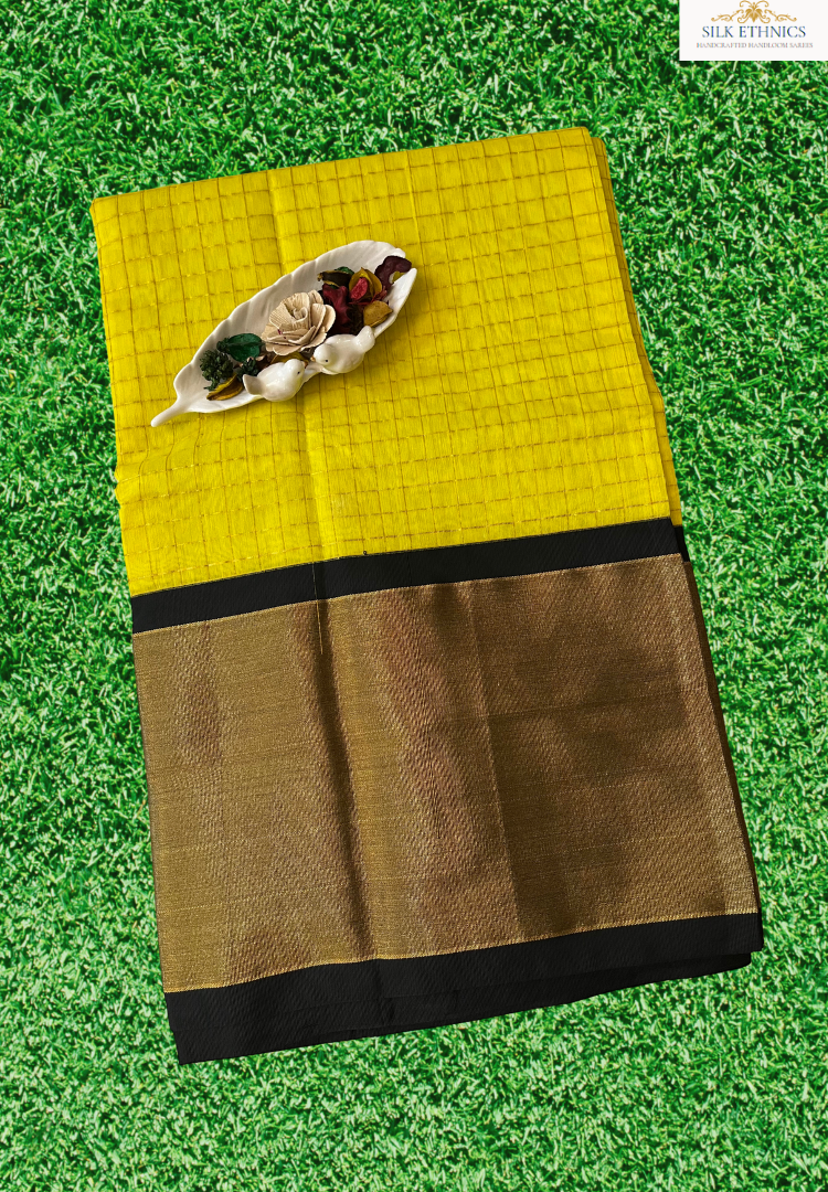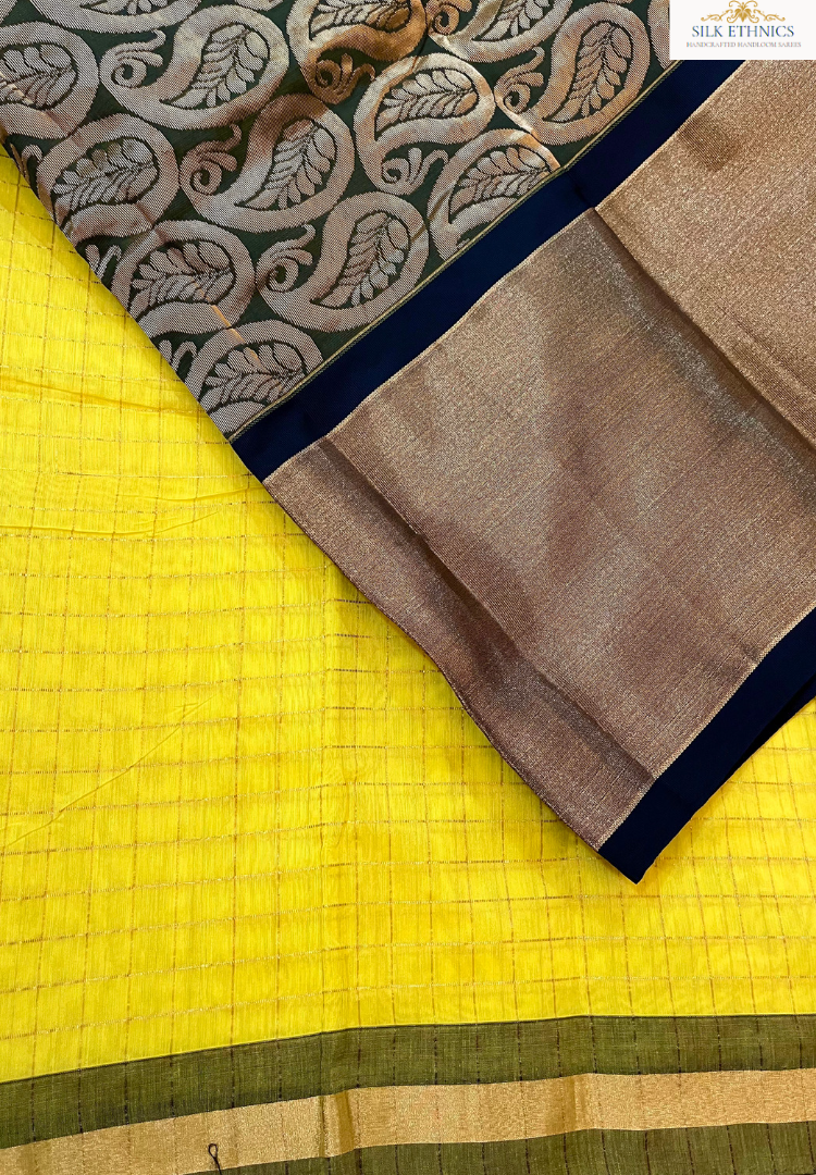 A vibrant yellow and green Chanderi Silk saree with all over golden checks weaving and beautiful motif design rich heavy Pallu.
