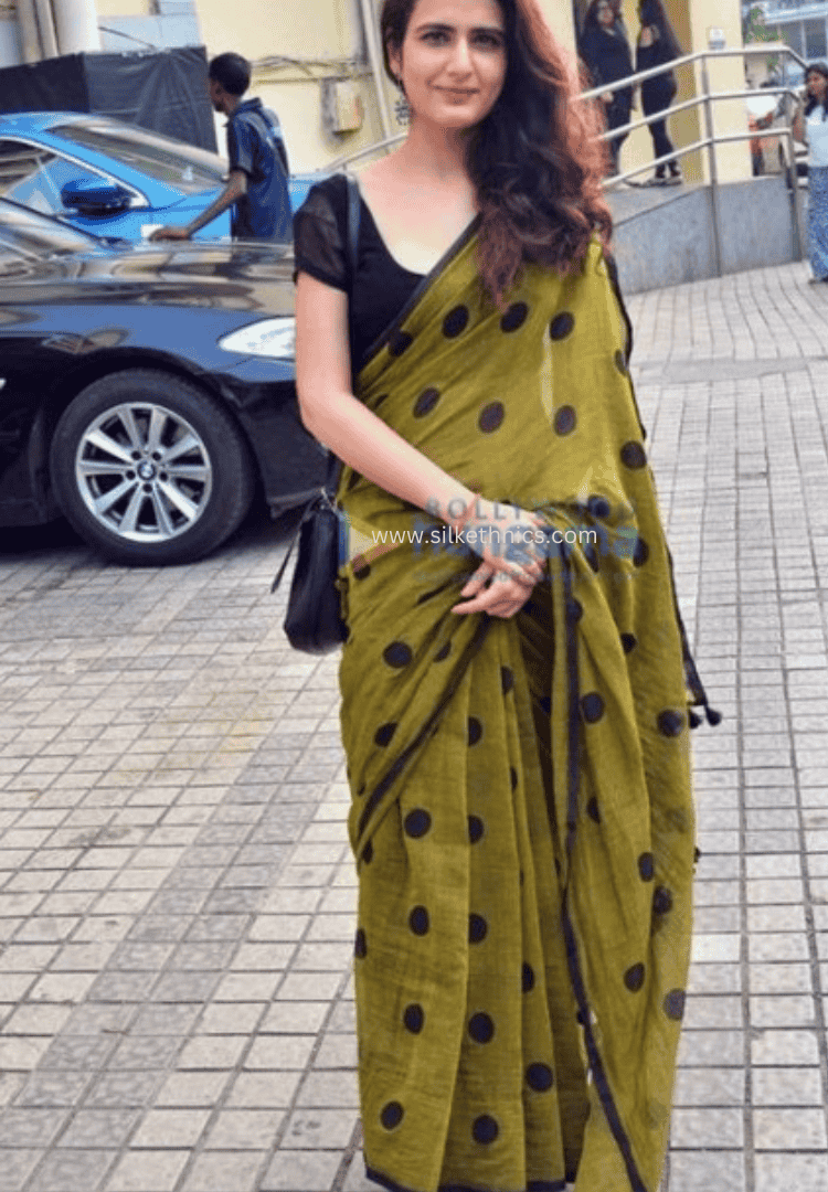 Introducing our luxurious Olive green Rangreet Polka saree, with handpainted polka dots. This light weight and soft flowy saree exudes a celebrity style that is both elegant and exclusive. Elevate your fashion with this one of a kind piece that is perfect for any occasion.