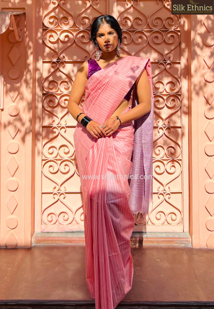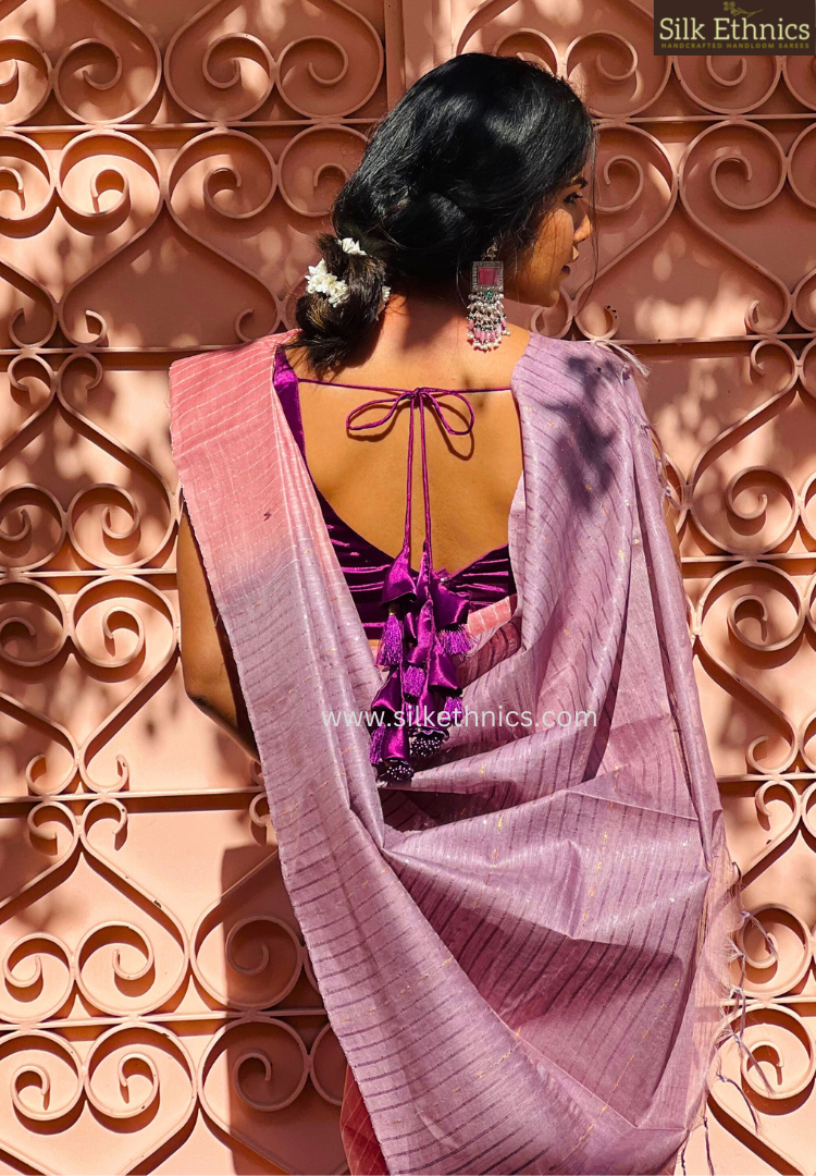 Discover the luxurious beauty of our Semi-tussar silk saree in pastel pink and lavender. This semi tussar saree features delicate thread work stripes allover and a shimmering sequin accents on the pallu. Elevate your style and stand out with this exclusive piece.