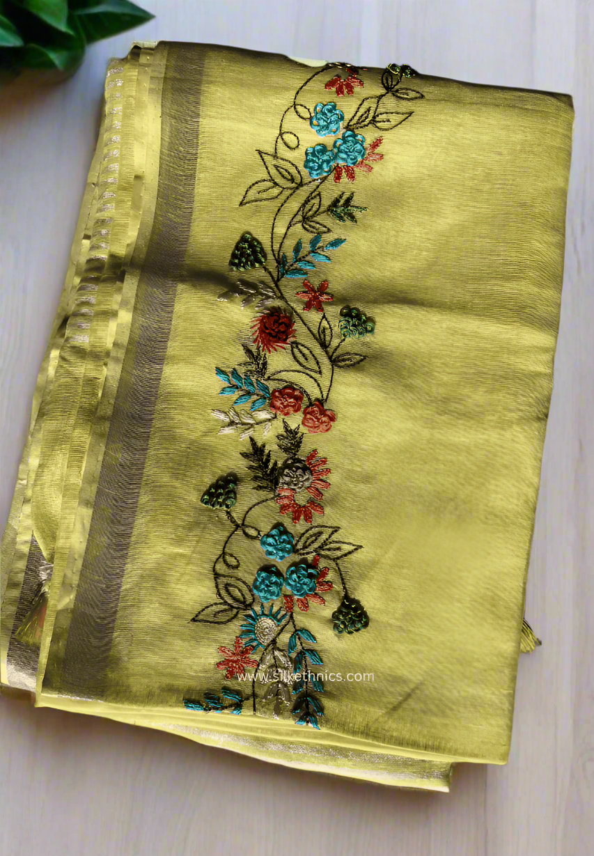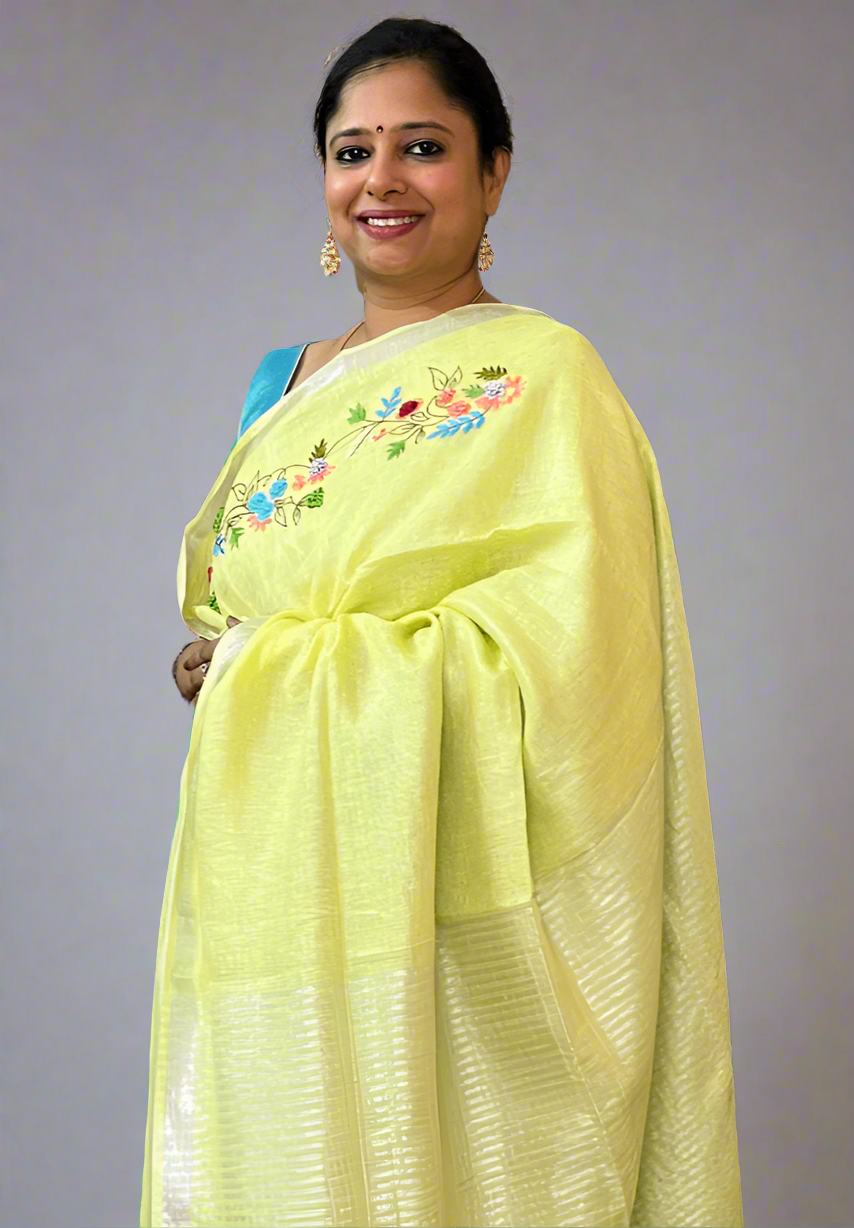 This pastel yellow Sitara linen saree offers a pleasant and elegant look, perfect for both office and casual wear. Crafted from breathable linen, it ensures comfort while maintaining a classy appearance. The intricate embroidery detailing adds a touch of sophistication, making it an ideal choice for a refined and graceful style.