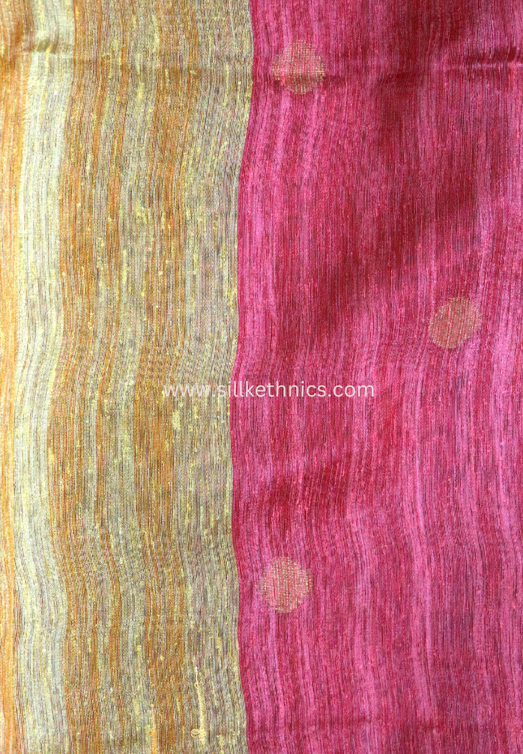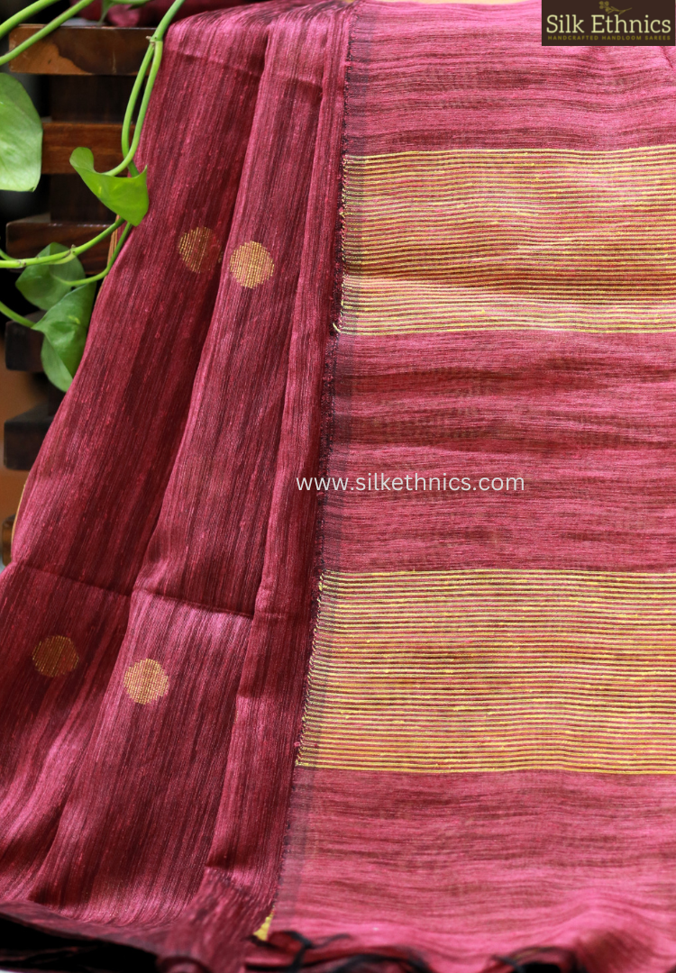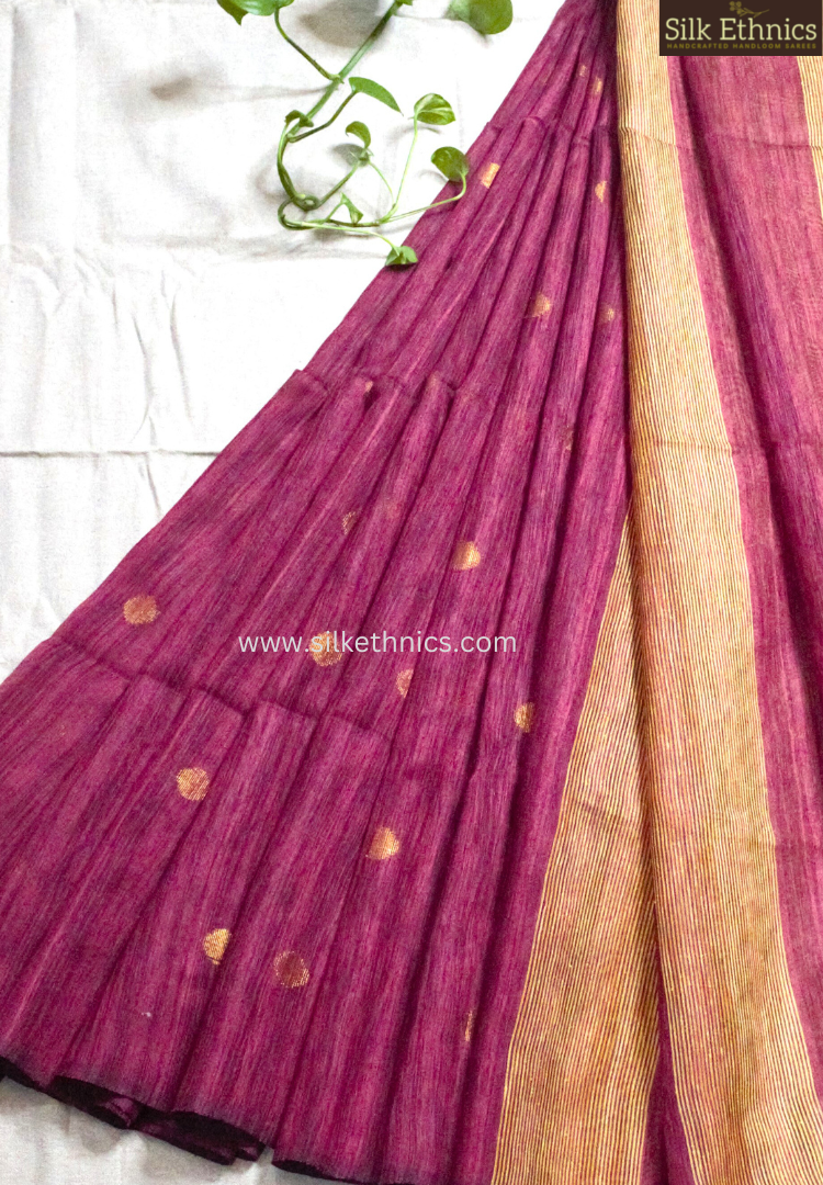 Indulge in luxury with our dark fuschsia polka sico saree. The intricate zari polka dot design and gicha pallu weaving add an elegant touch to this sico saree. Elevate your saree collection and make a statement with this exclusive piece.