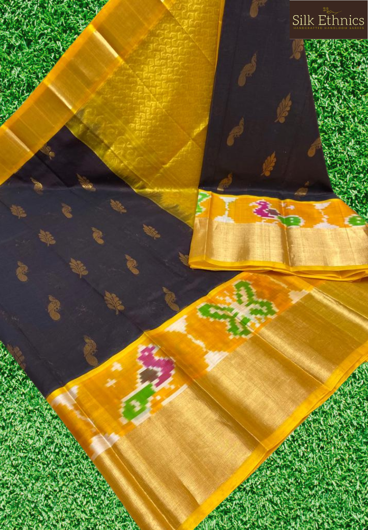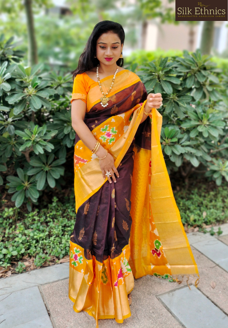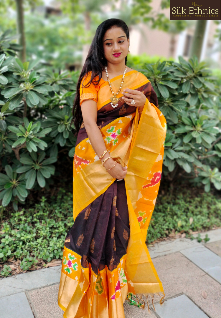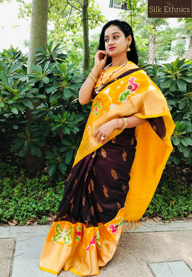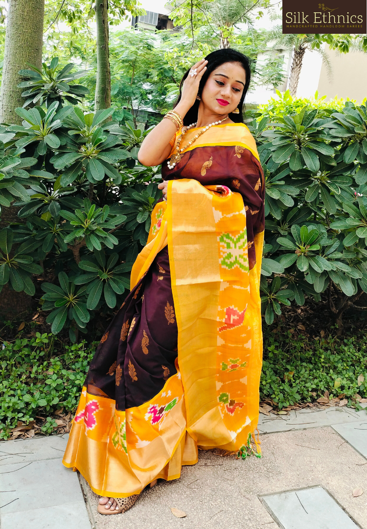 A gorgeous rich brown pure handloom kuppadam silk saree with a woven Pochampally border with zari kaddi and rich contrast pallu. The saree has beautiful peacock motifs woven all over.