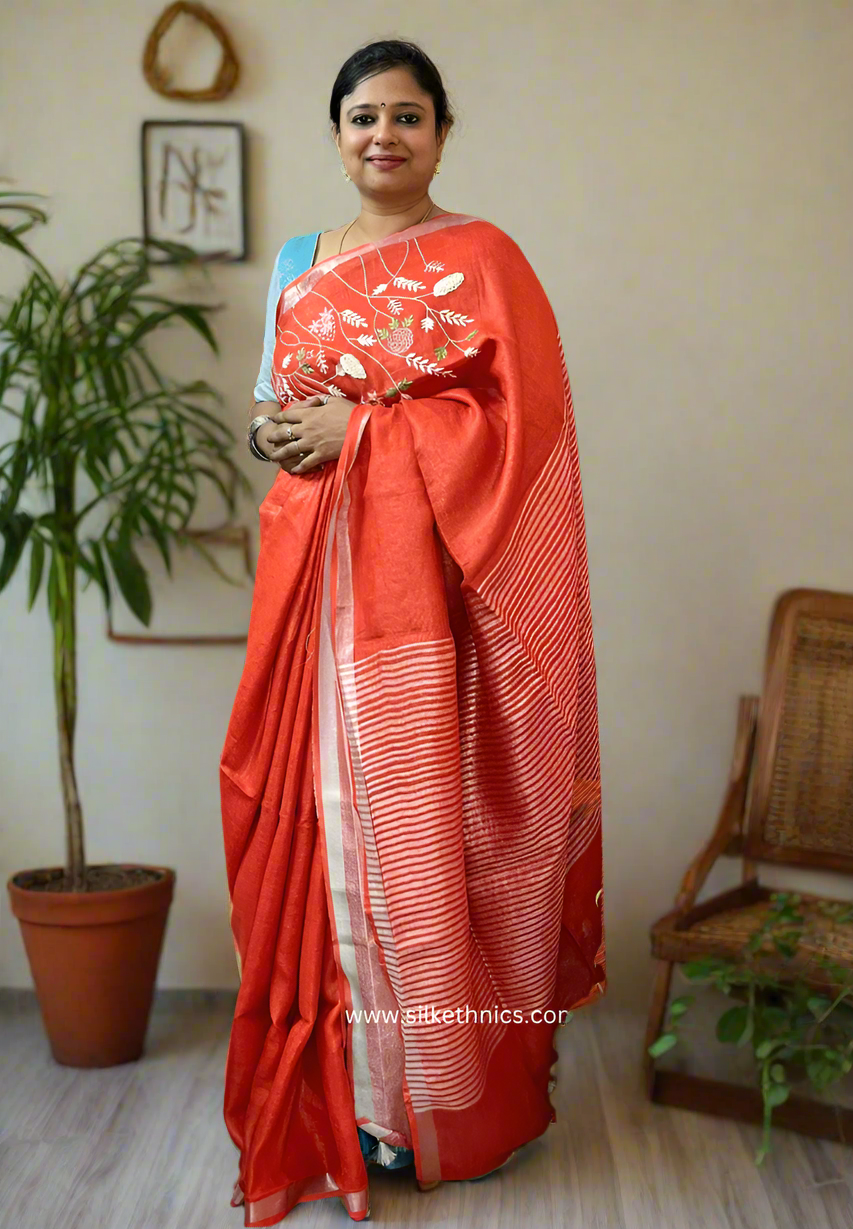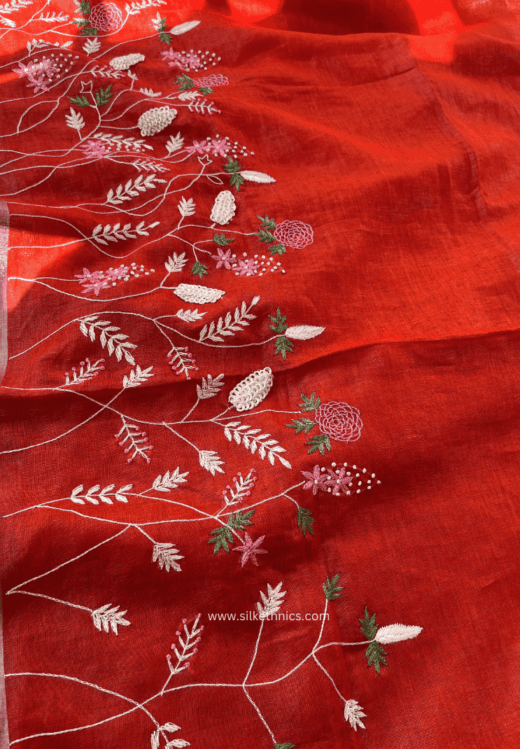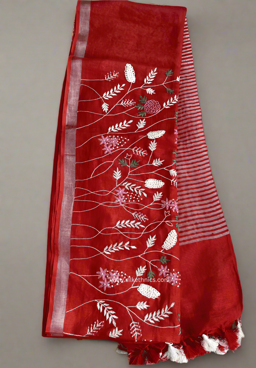 The Royal Red Sitara linen saree features exquisite embroidery that enhances its elegant and classy appeal. Made from breathable linen, it offers exceptional comfort for all-day wear, making it a perfect choice for sophisticated occasions where style and ease go hand in hand.