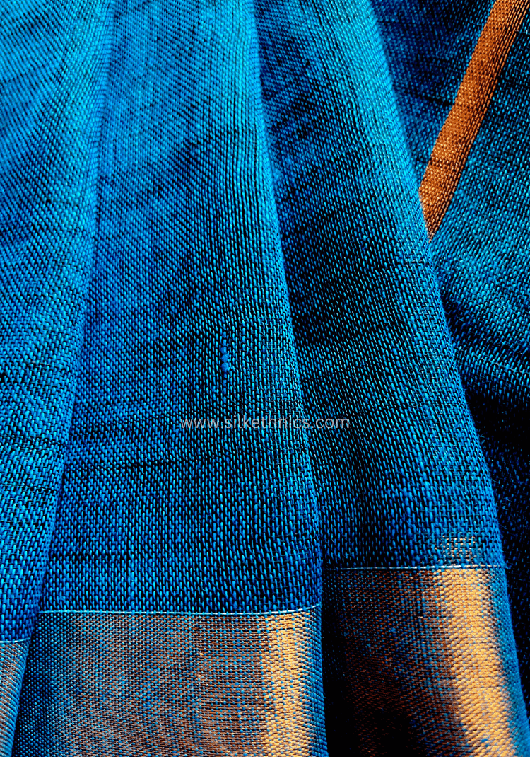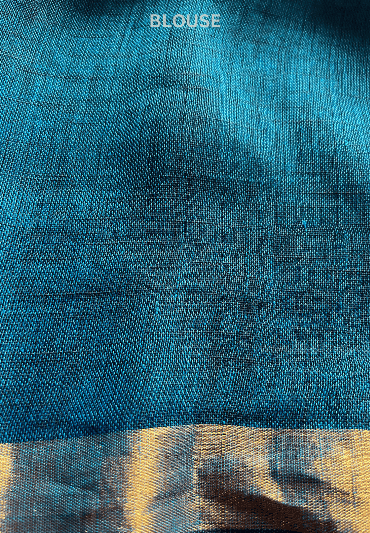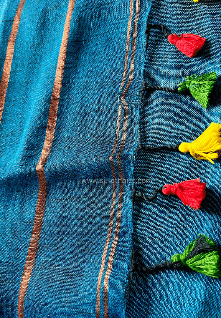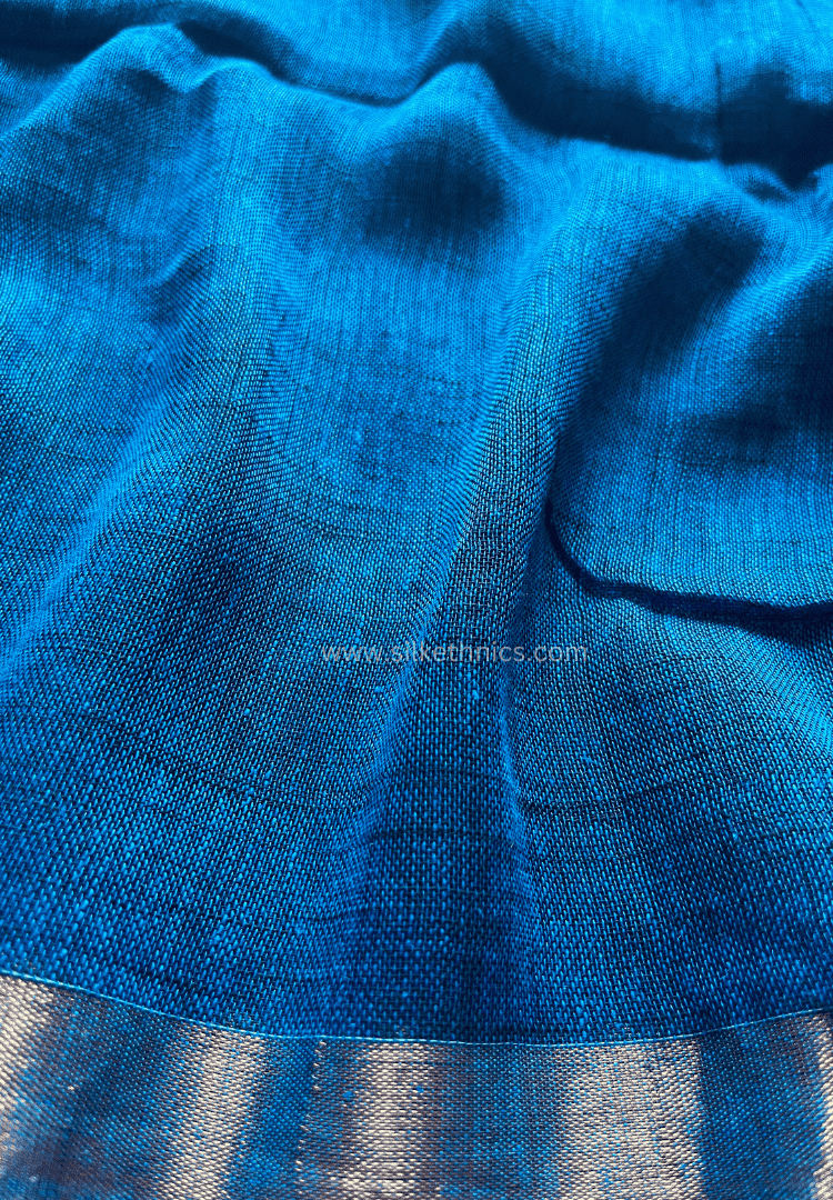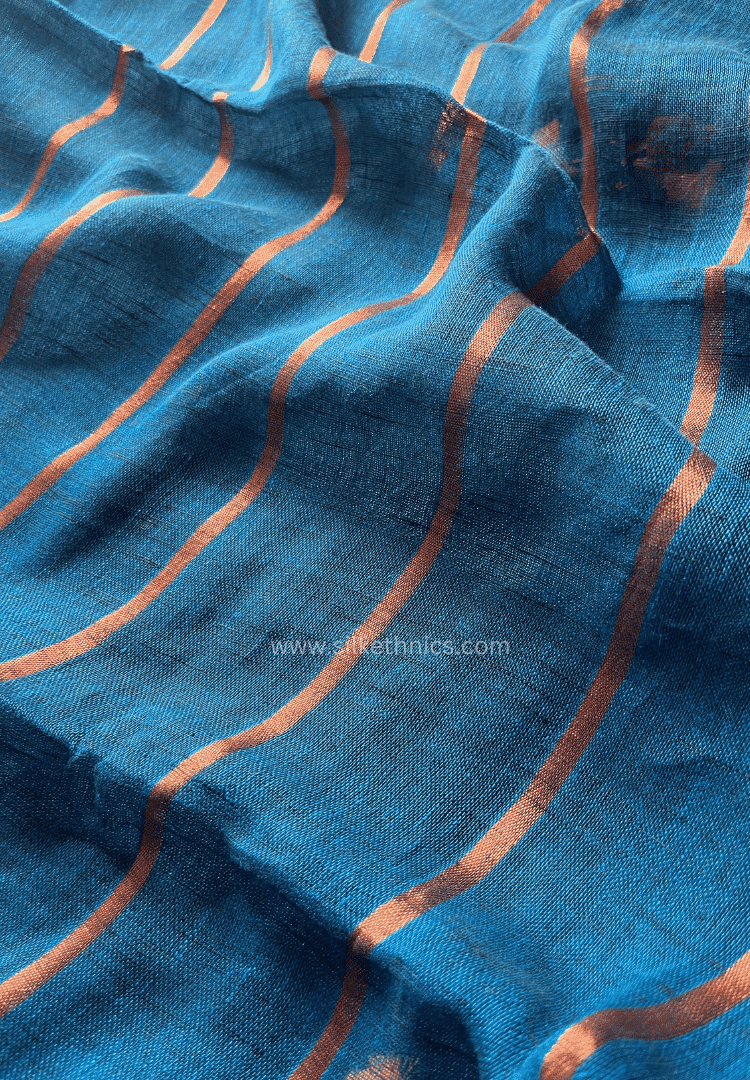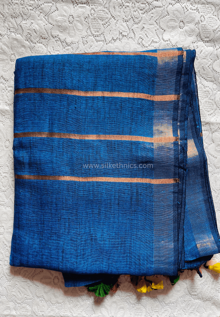 Indulge in the sophisticated elegance of our Sapphire Blue Meera Linen Saree. Adorned with vibrant zari stripes, this exquisite saree exudes grace and luxury. The striking sapphire blue color will make you stand out in any occasion. Complete your collection with this exclusive piece.