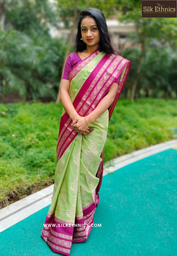 A graceful Banarasi semi georgette Khaddi silk saree in pista green and pink combination with rich pallu and contrast blouse. saree has zari woven floral design all over and a beautiful contrast border.