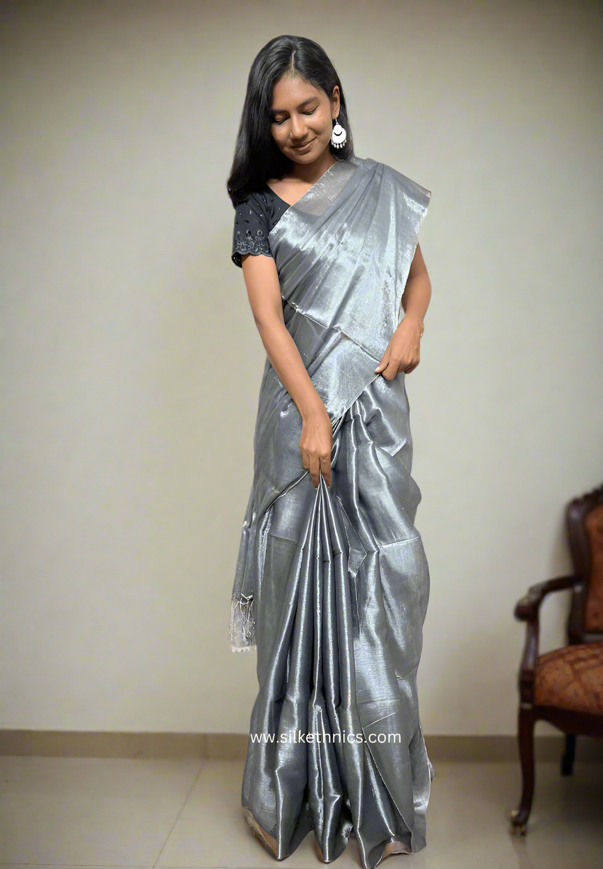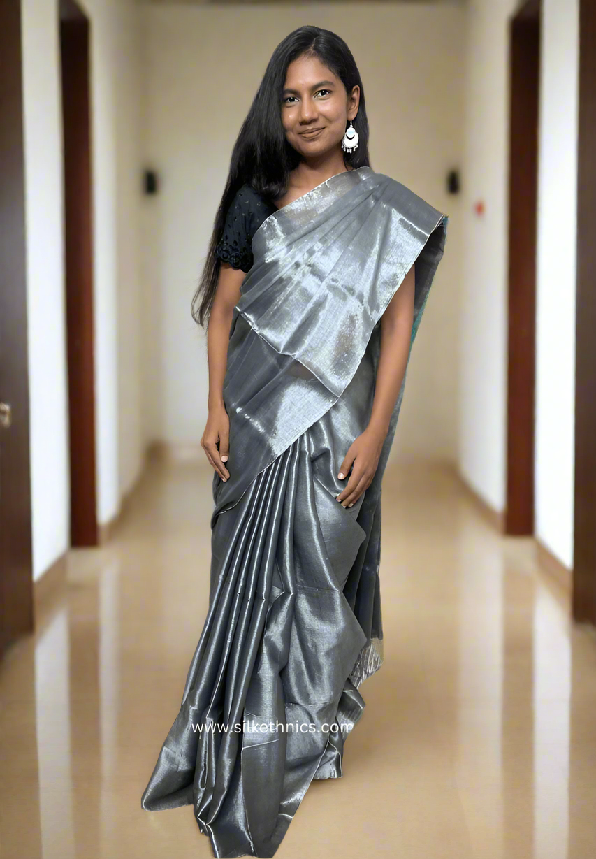 Elevate your elegance with this silver grey Raga tissue saree, crafted from pure handloom fabric. Its soft, lightweight texture ensures comfort while exuding a refined, timeless charm. Perfect for sophisticated occasions, this saree blends traditional craftsmanship with modern grace.