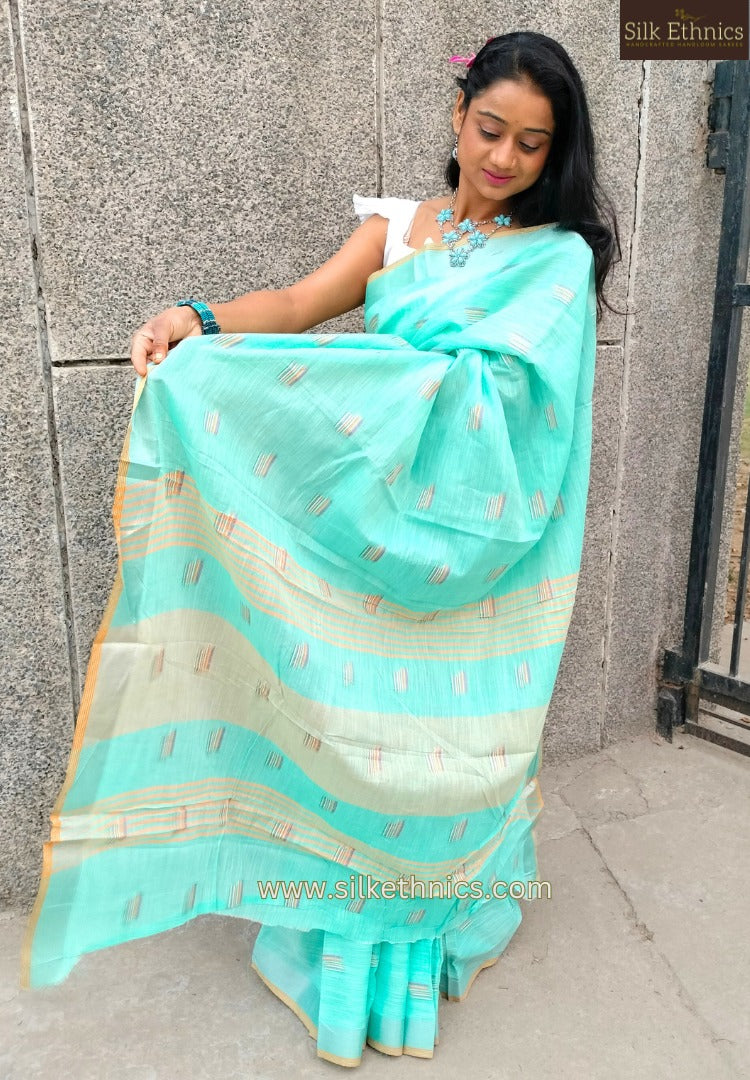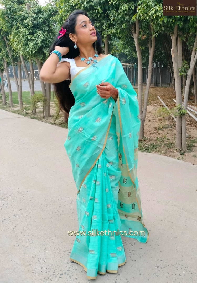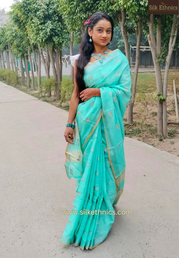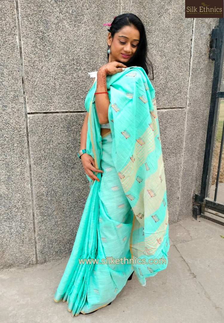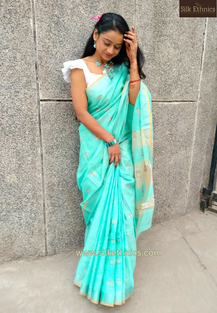 This turqoise green slub linen saree combines the vibrant appeal of turqoise with rustic texture of slub linen. The slub linen fabric offers comfort and breathability, while its colour adds a lively and stylish touch to the ensemble. This saree is an excellent choice for casual and festive occasions.