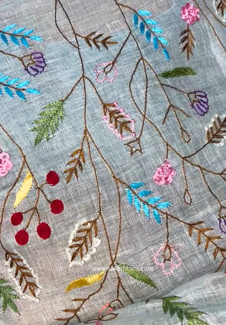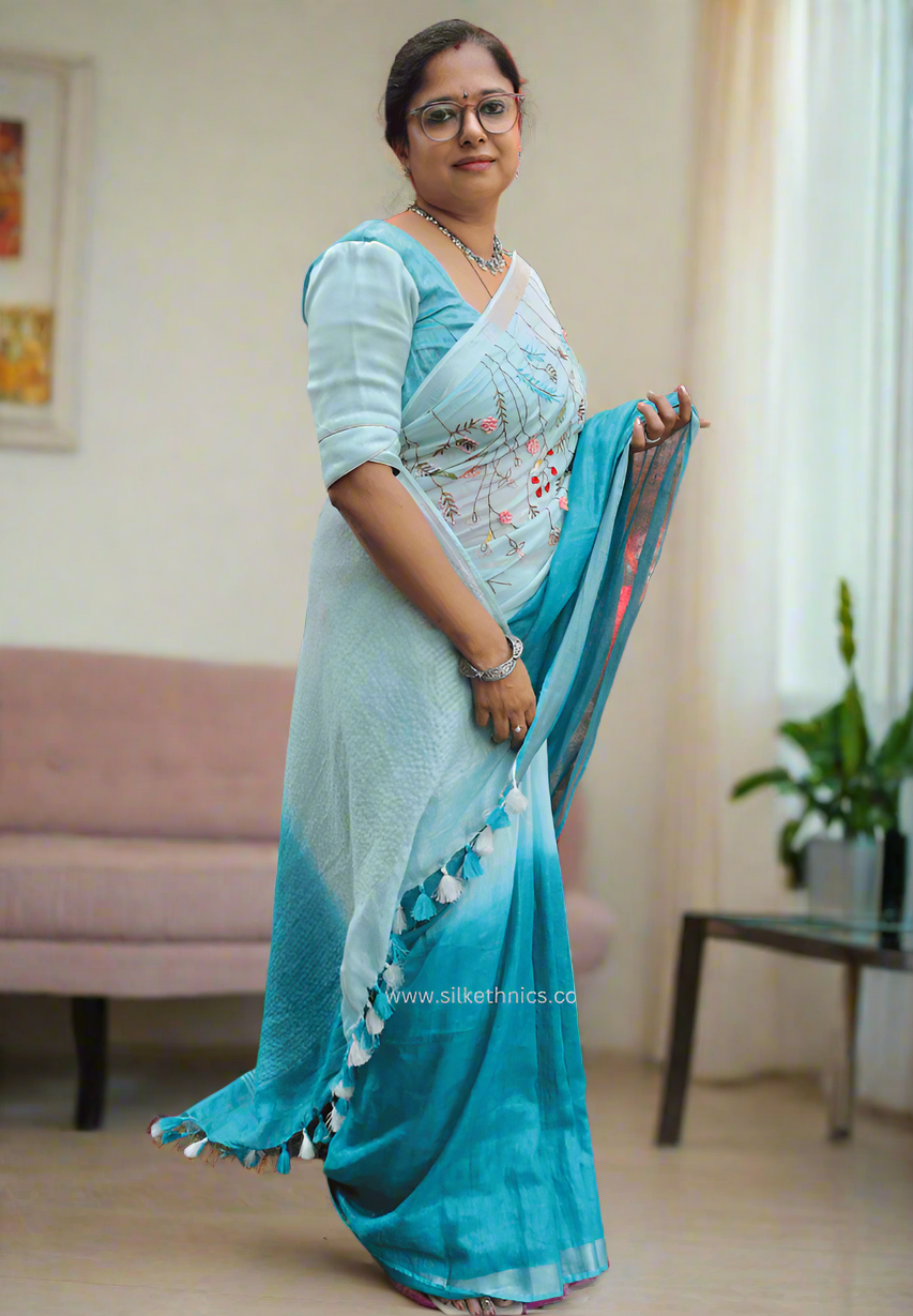 This twin blue Sitara linen saree features a dual-shaded design with intricate hand embroidery, showcasing an elegant and sophisticated pallu. Perfectly suited for both official and festive occasions, it combines traditional craftsmanship with a refined aesthetic to elevate your wardrobe.
