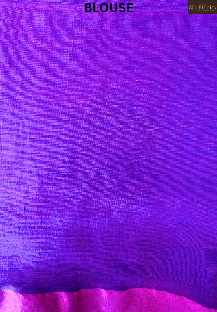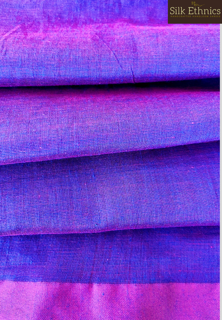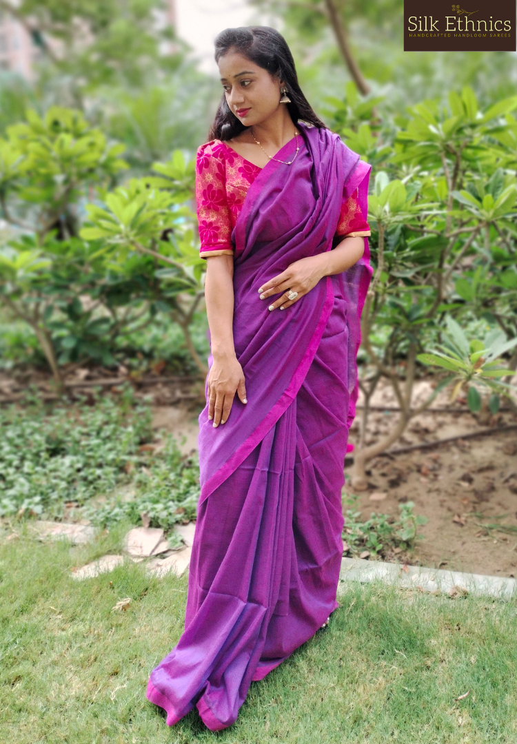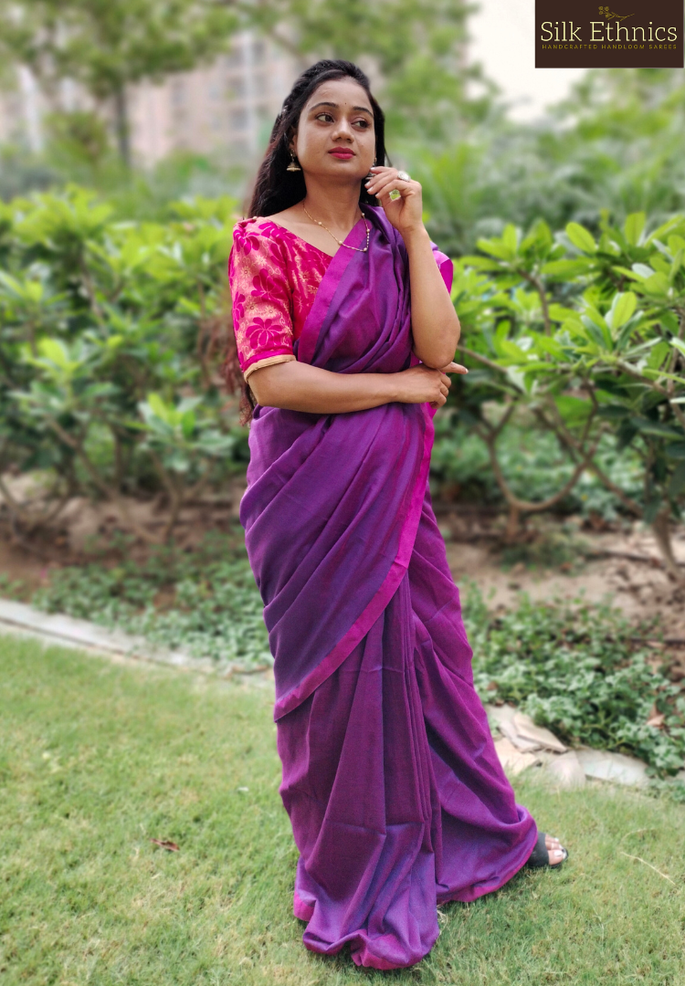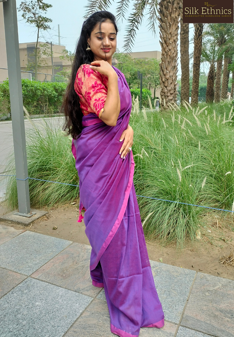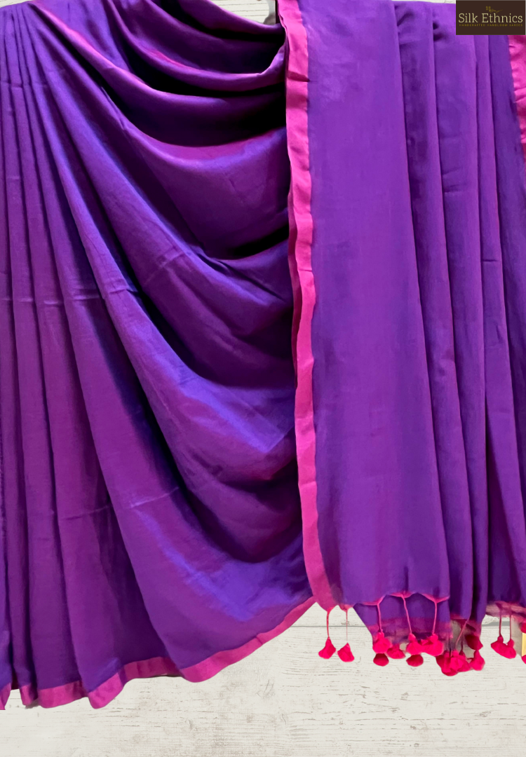 A gorgeeous purple colour pure handloom mul cotton saree with tassled pallu and running blouse