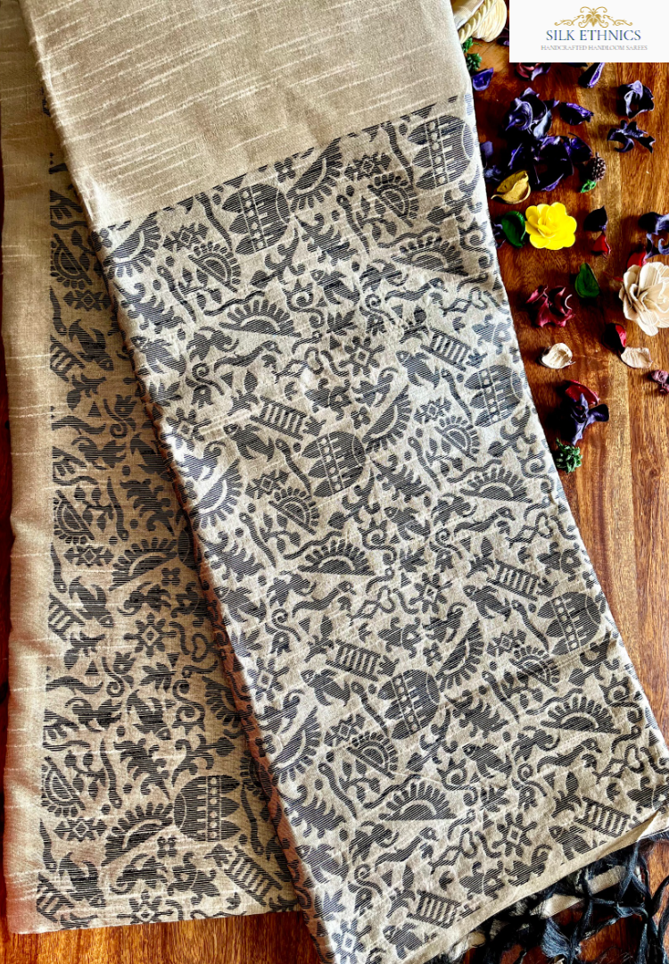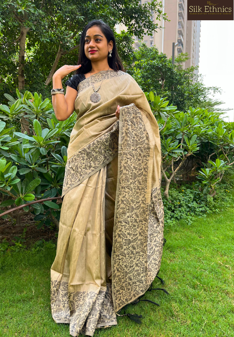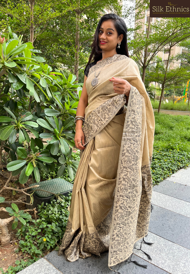A stunning handwoven semi tussar silk saree with a beautiful kalamkari styled jaquard border and pallu with a contrast black blouse.